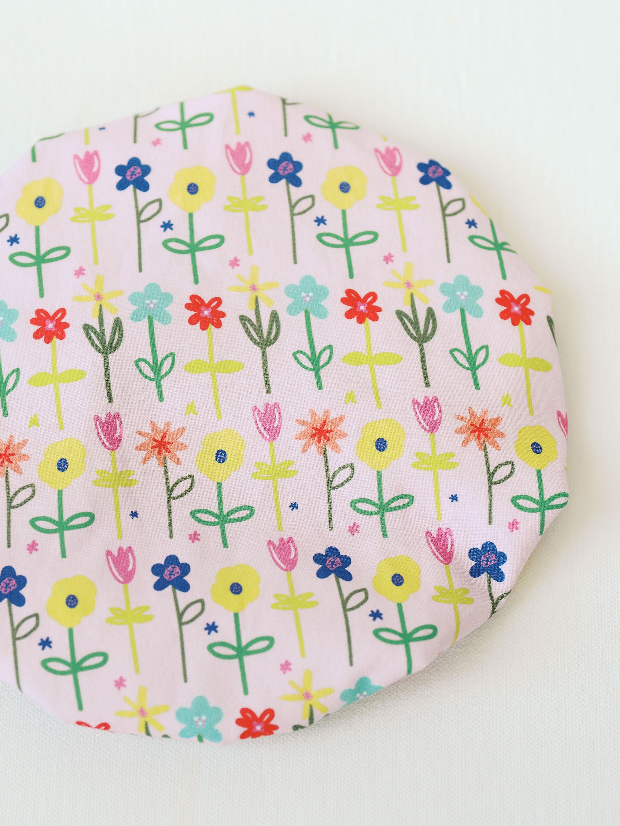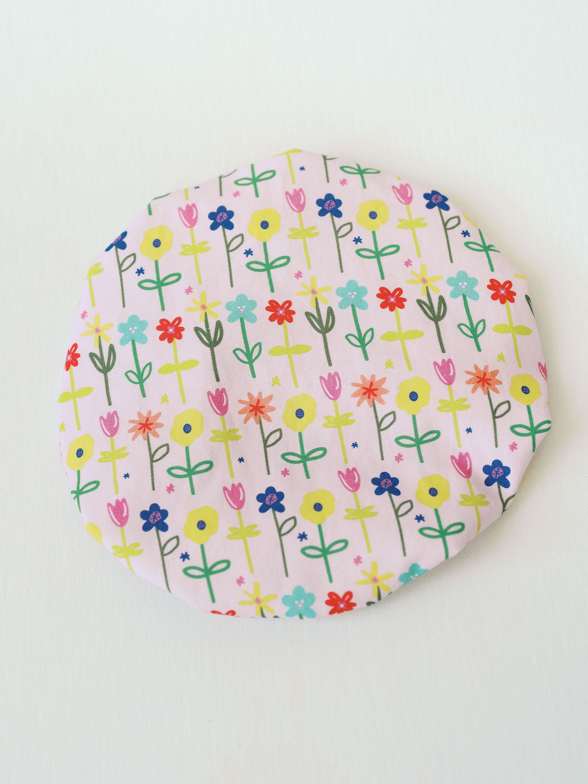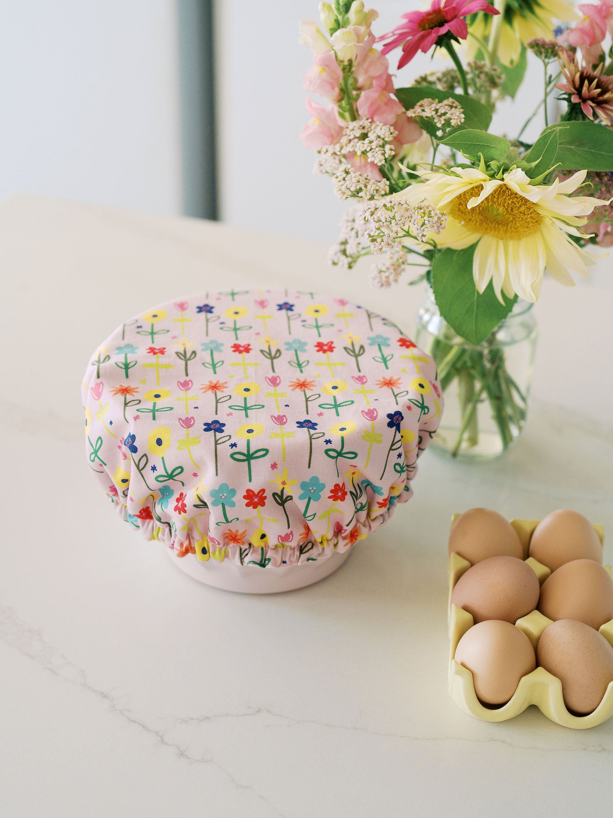 Brighten your leftovers, doughs, and serving bowls with this vibrant Petal Party cover. Sized to fit smaller bowls, it features a soft cotton exterior adorned with rows of happy flowers, plus a wipeable, food-safe lining. Elastic edging creates a tight seal to keep things fresh—no plastic wrap needed!