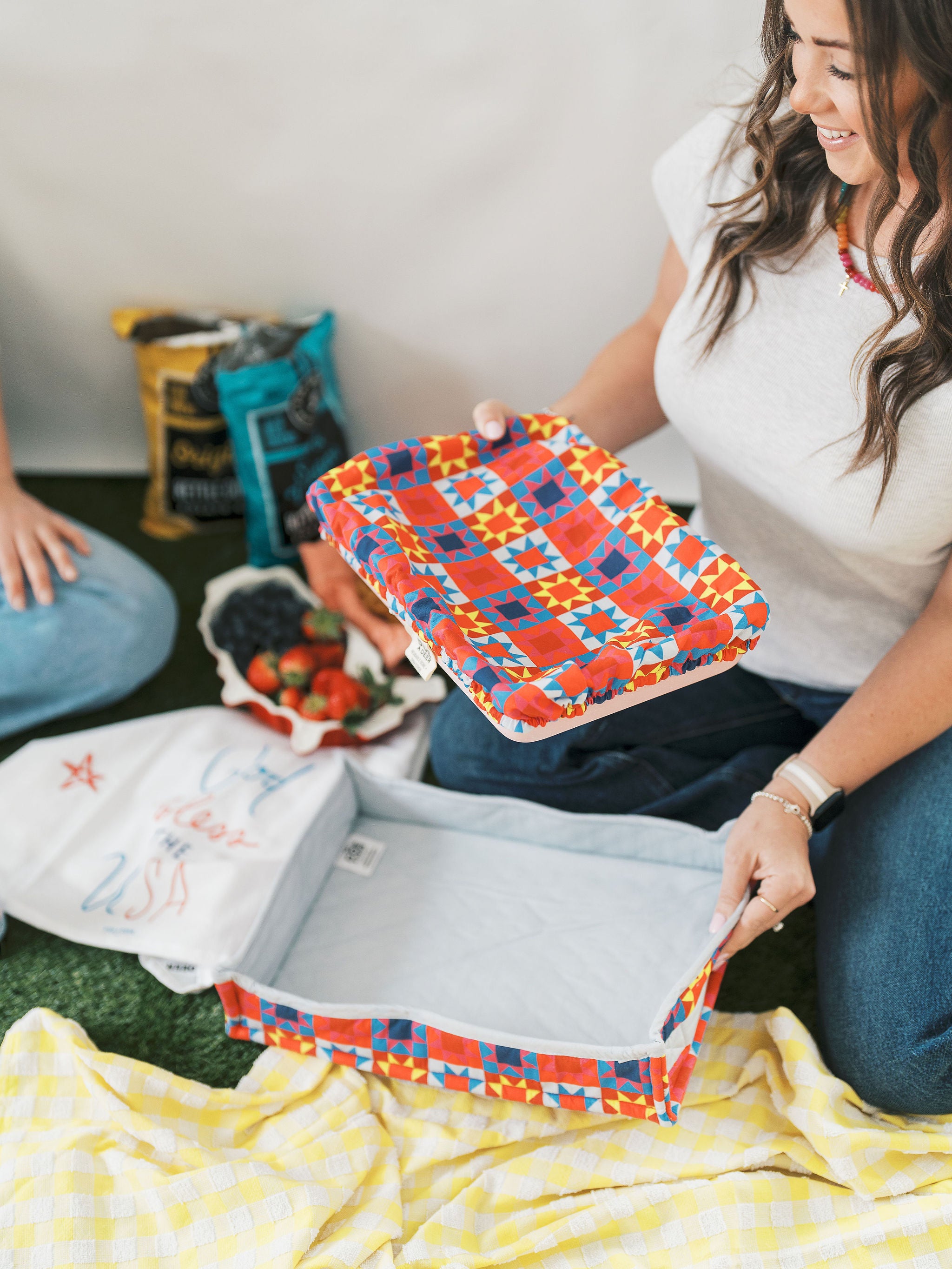 This quilt-inspired dish cover fits perfectly over 9x13 pans, keeping your food fresh in the cutest way! With bright reds, blues, and cheery starbursts, it’s stretchy, reusable, and oh-so-charming—because every dish deserves a little extra love! It's as cute as it is practical.