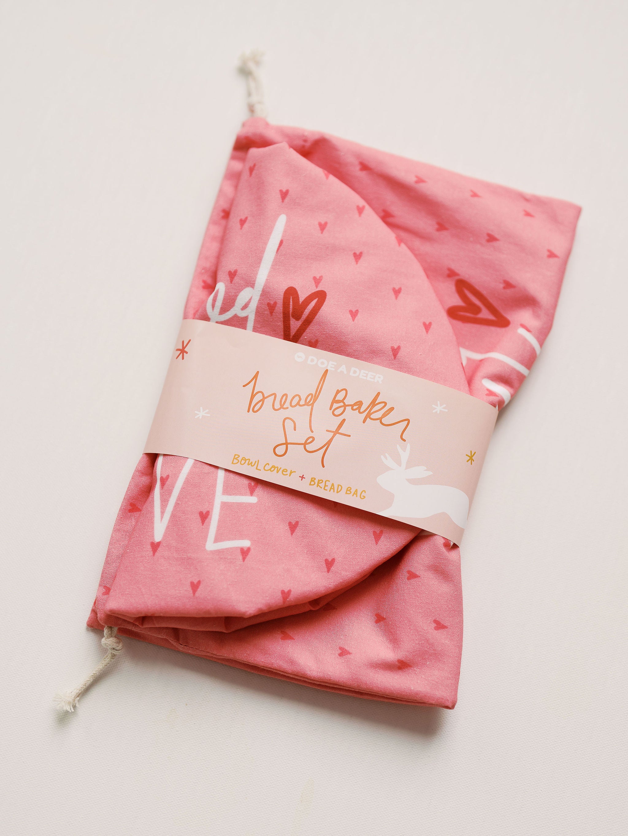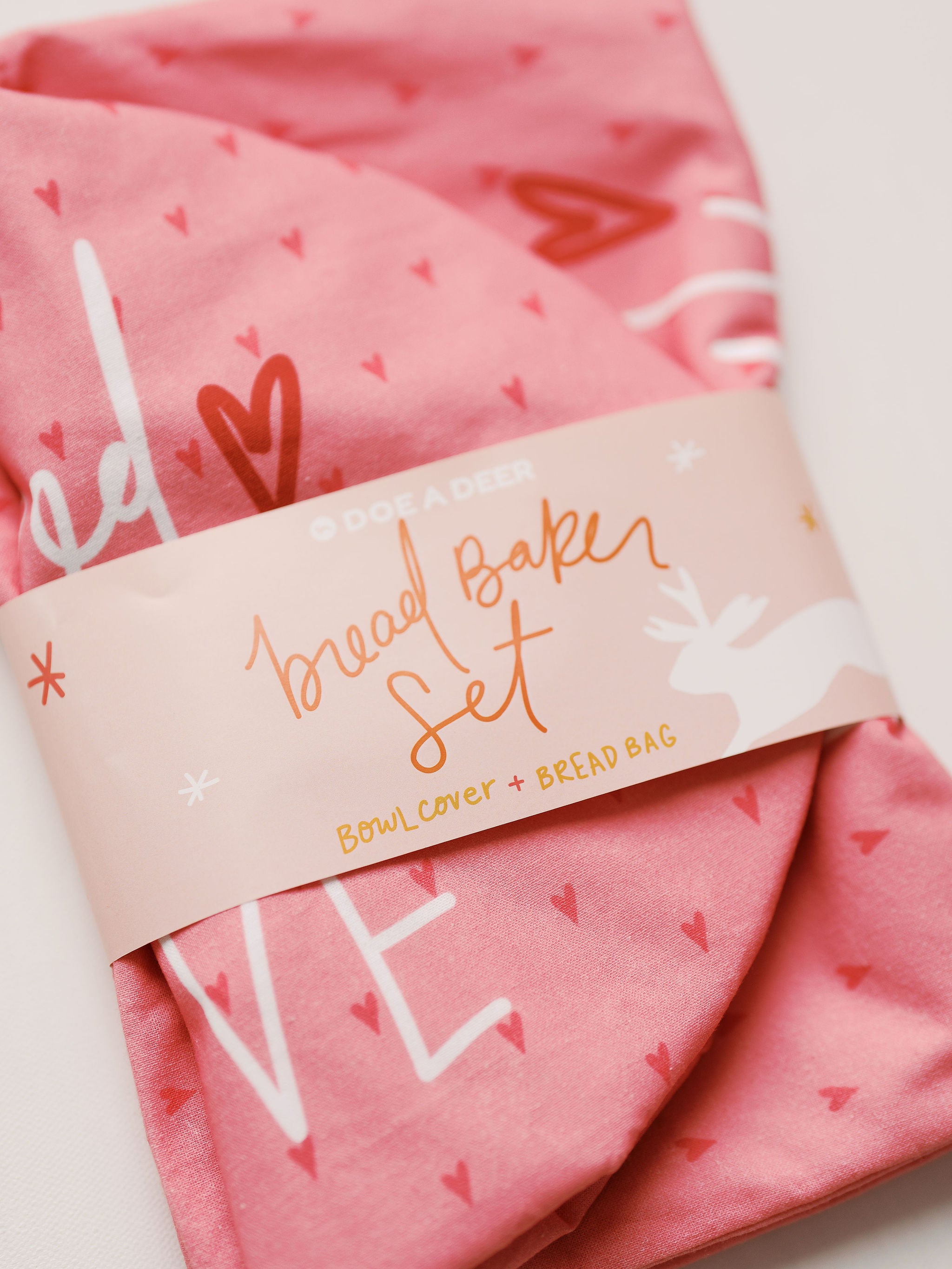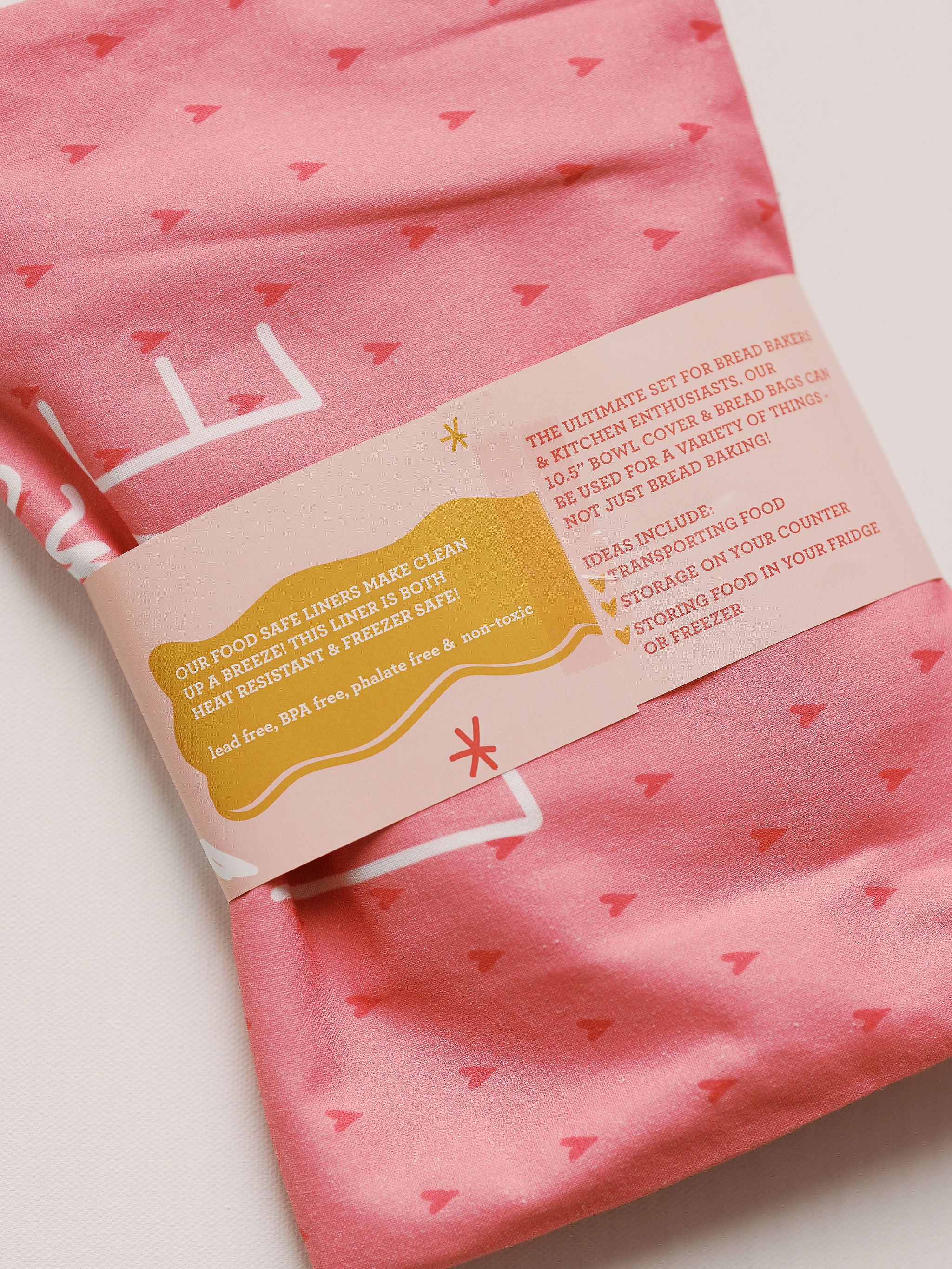 Keep dough rising and loaves looking lovely with the Baked with Love Bread Baker Set — a matching Baked with Love bowl cover and bread bag in a cheerful pink with tiny hearts. Perfect for dough proofing, and storing fresh-baked bread, this eco-friendly duo replaces cling film and plastic bags while adding a pinch of whimsy to your countertop.