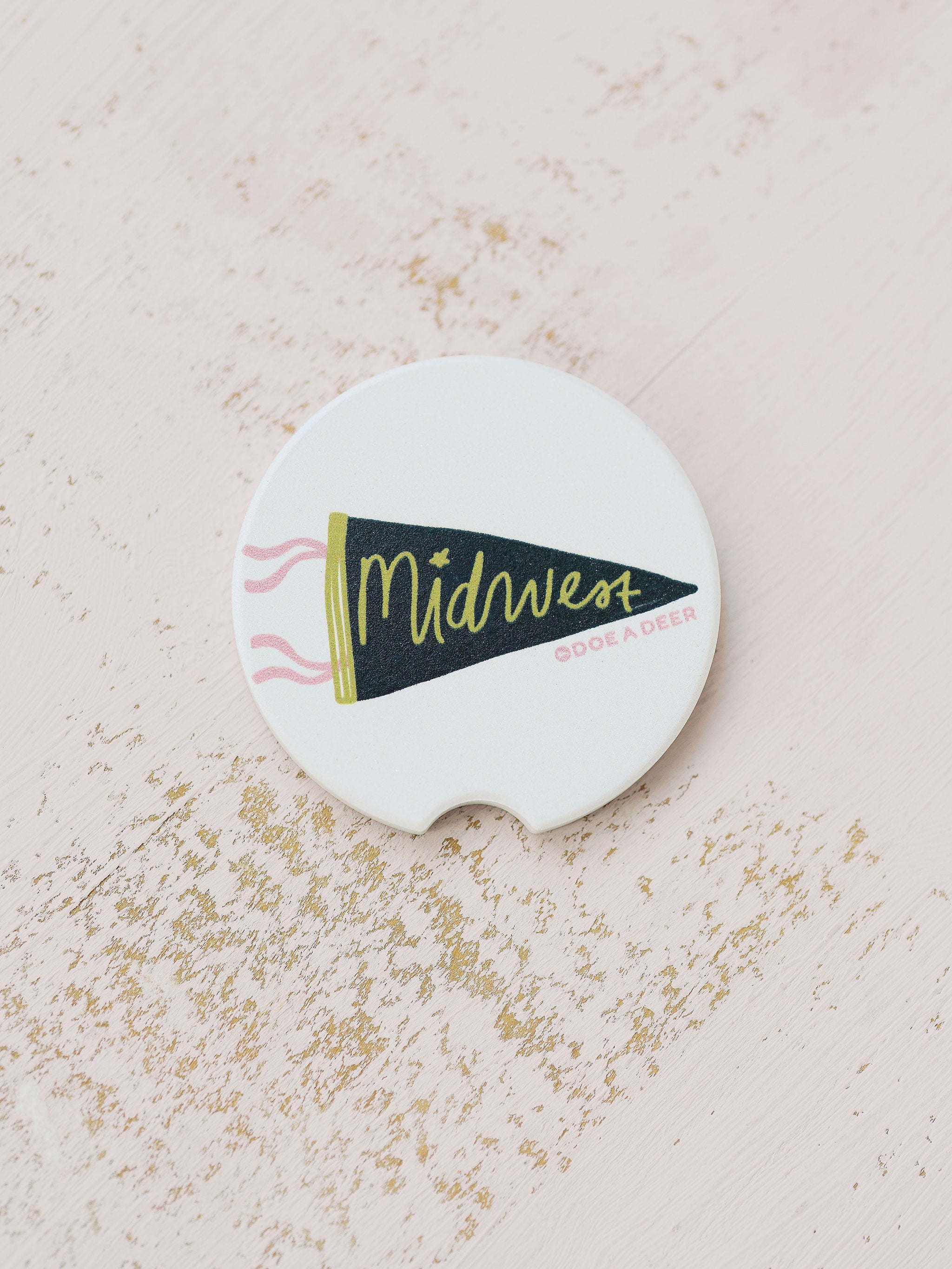 Show your Midwest pride with this bold pennant-style car coaster, featuring a retro black-and-gold design with pink accents. It’s absorbent, durable, and made to celebrate heartland roots in style.
