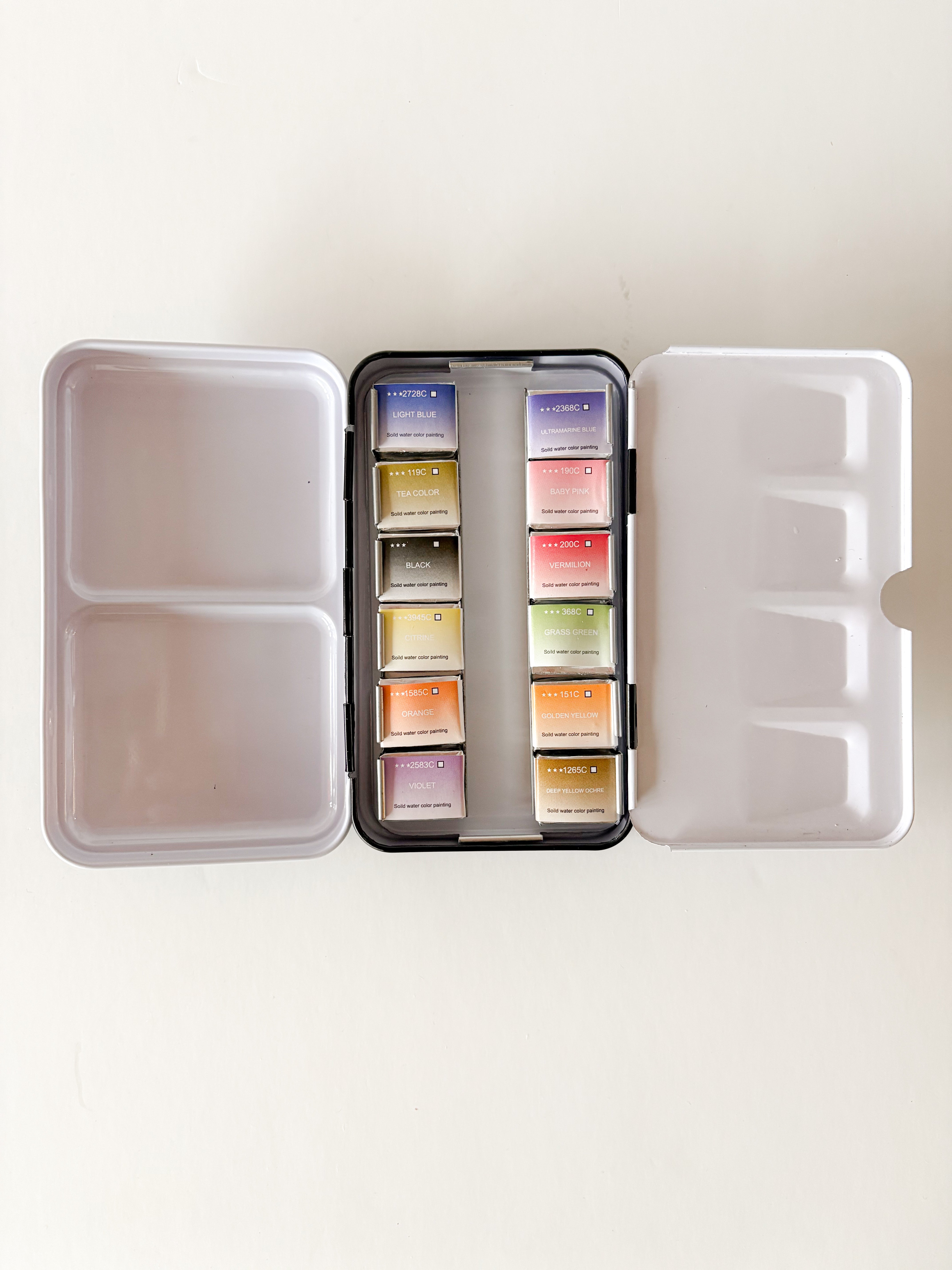 This assortment includes 12 pans of vibrant watercolor paints packed into an eco-friendly aluminum case. Fast drying and easy to clean up! Paintbrush not included.