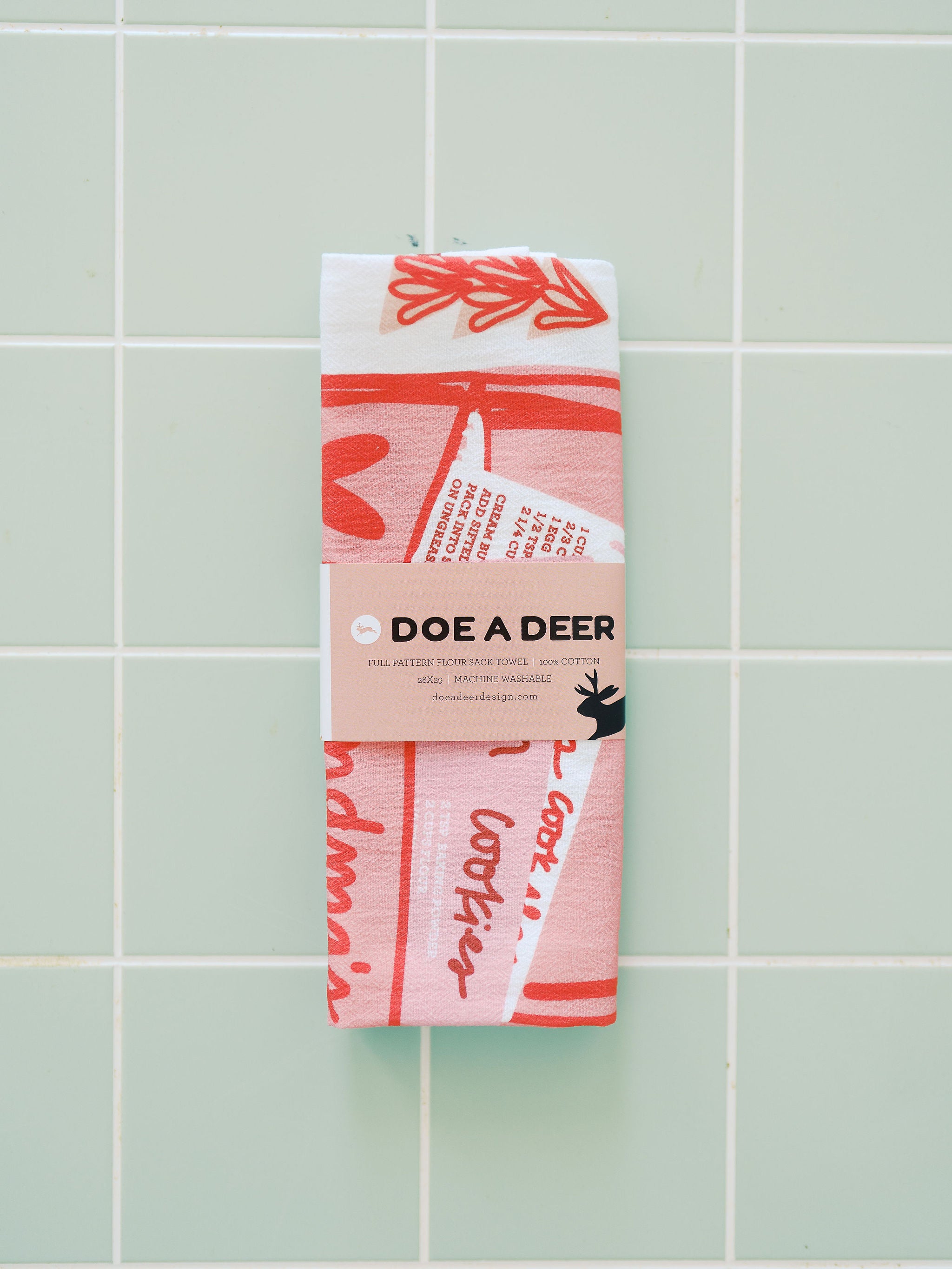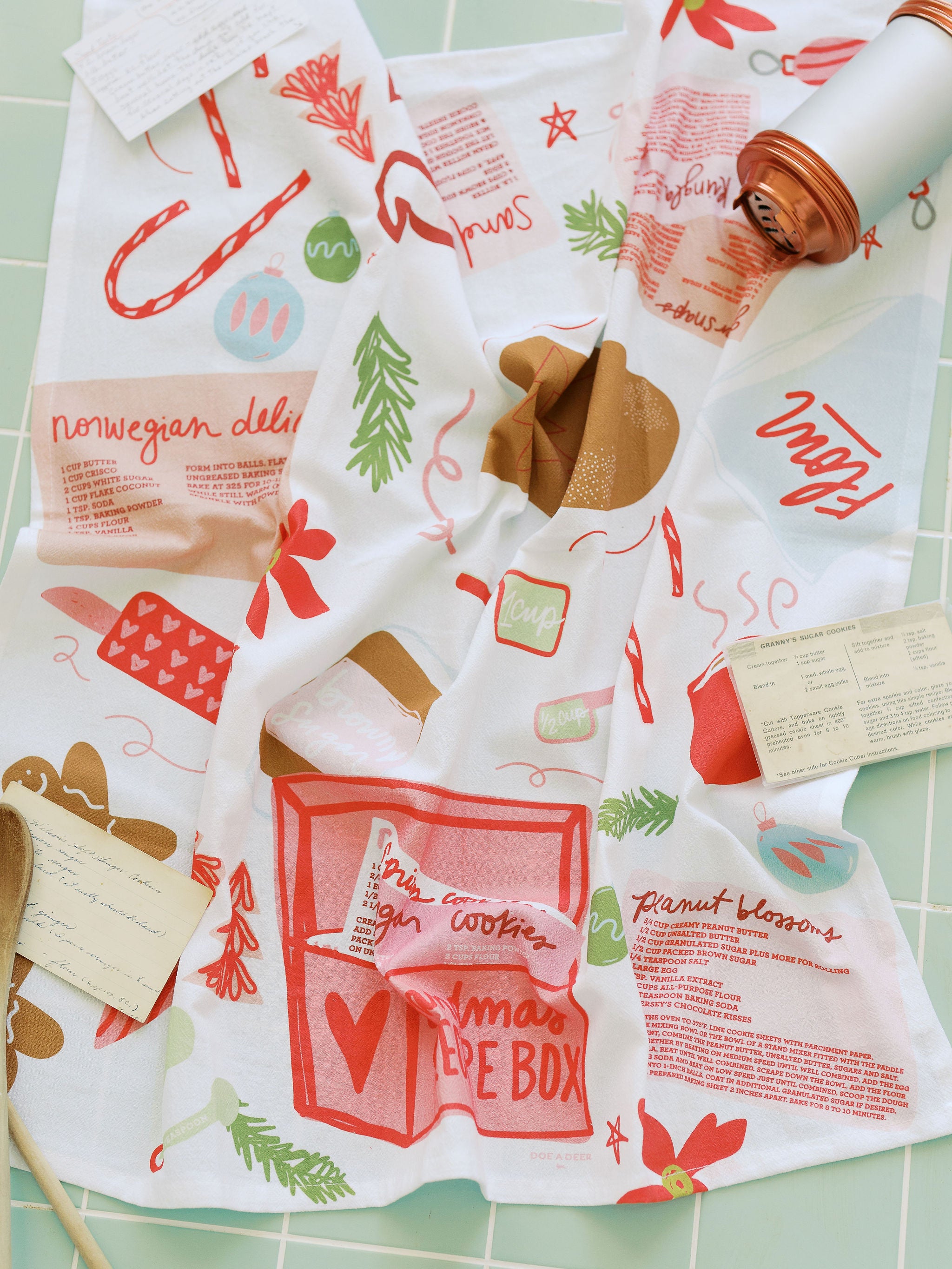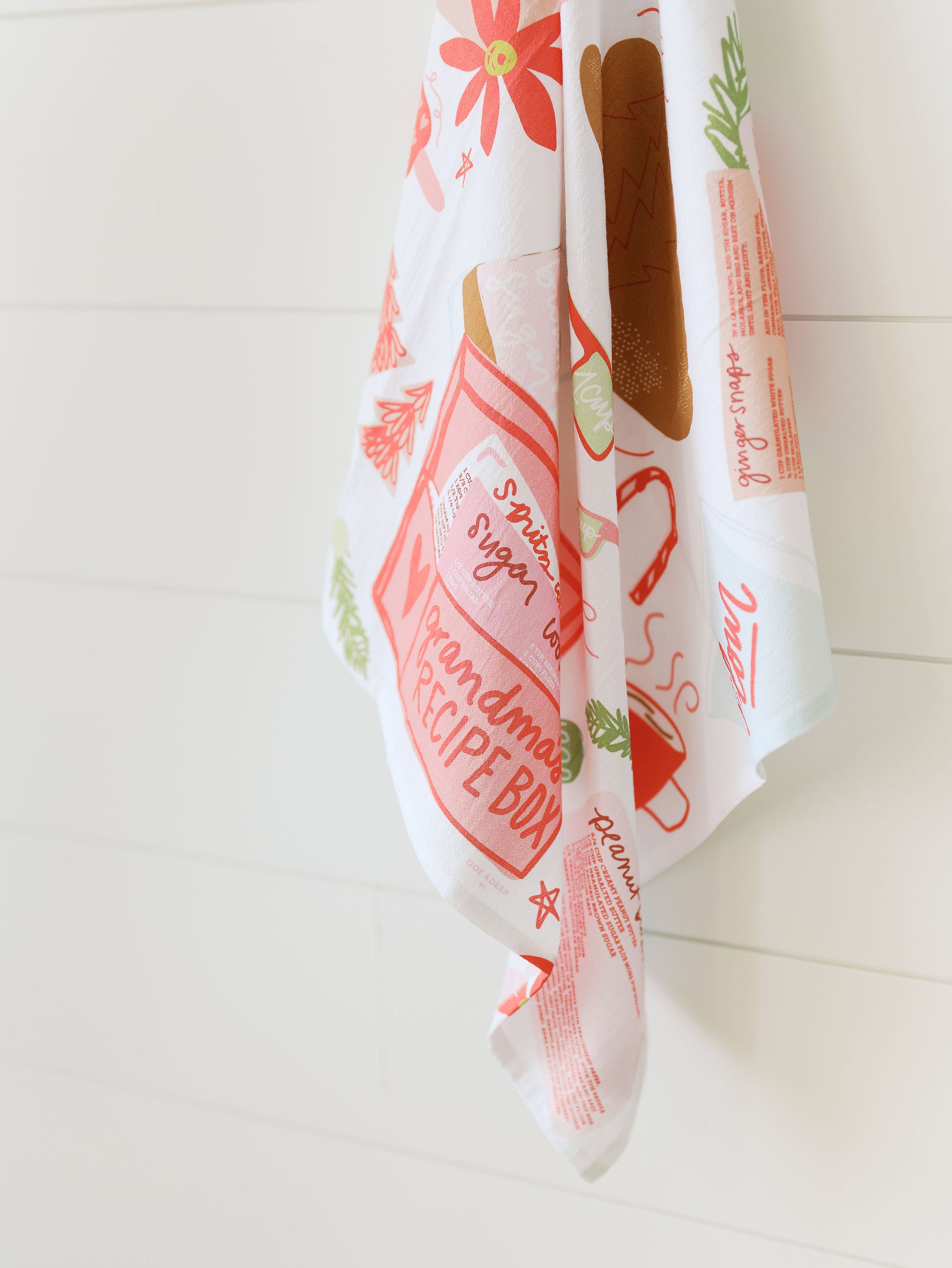 This towel reminds me of my Grandma’s kitchen! This 100% cotton flour sack towel features a nostalgic full pattern on a crisp white background, sprinkled with hand-drawn vintage recipe cards, baking essentials, candy canes, and sweet little details that tell the story of generations of love and flour-covered countertops. This is a great reminder to anyone that the best recipes are passed down with love. 🍪💕 I even picked a few of my family favorite holiday recipes to share with you!