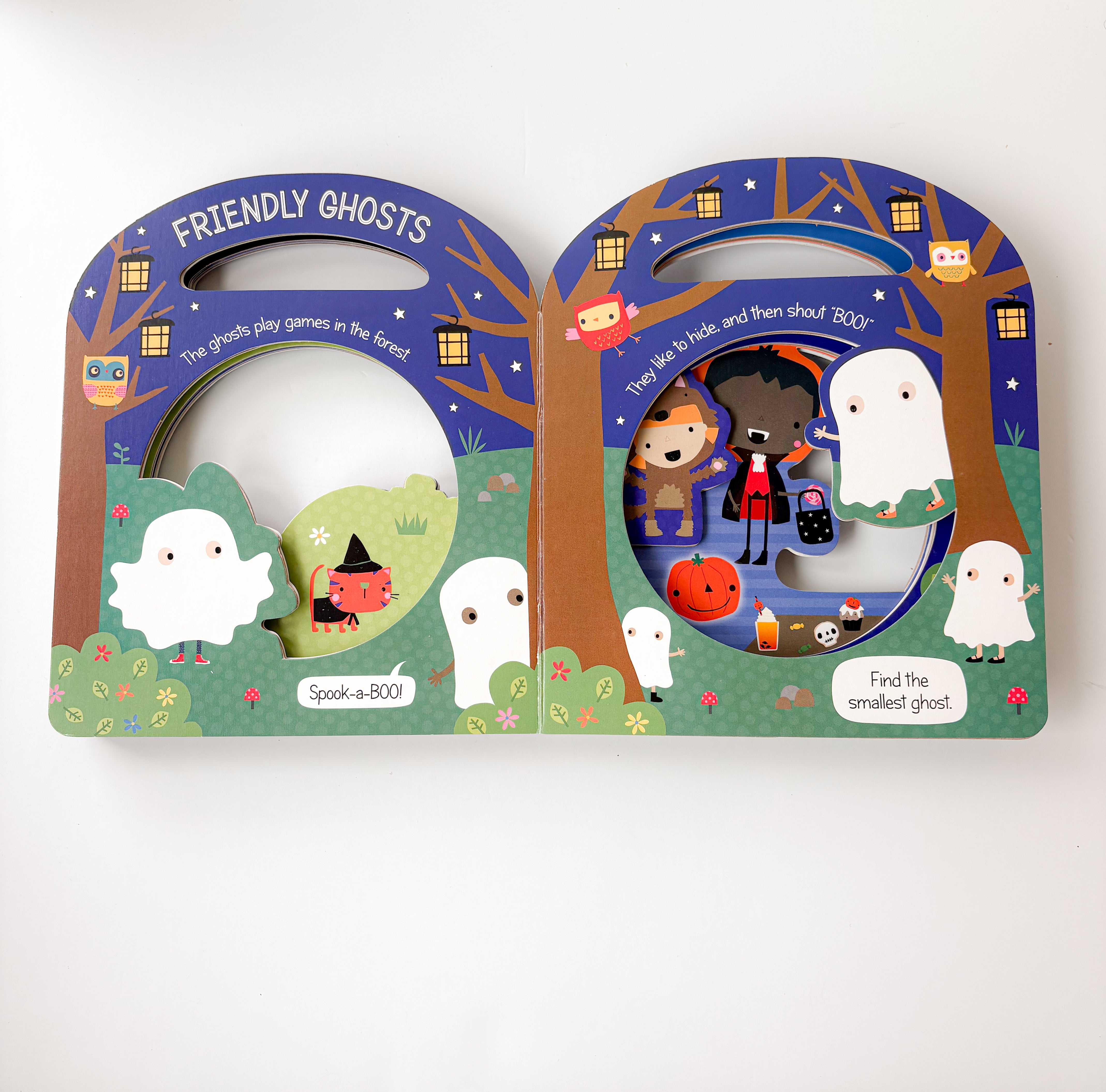 This cut-out board book is perfect for curious children who like to explore books with their hands. Turn the pages to meet new spooky characters, from skeletons to vampries! Simple facts are reinforced with fun activities, encouraging children to engage with story time. The carry-me handle is perfect for taking the book with you wherever you go!