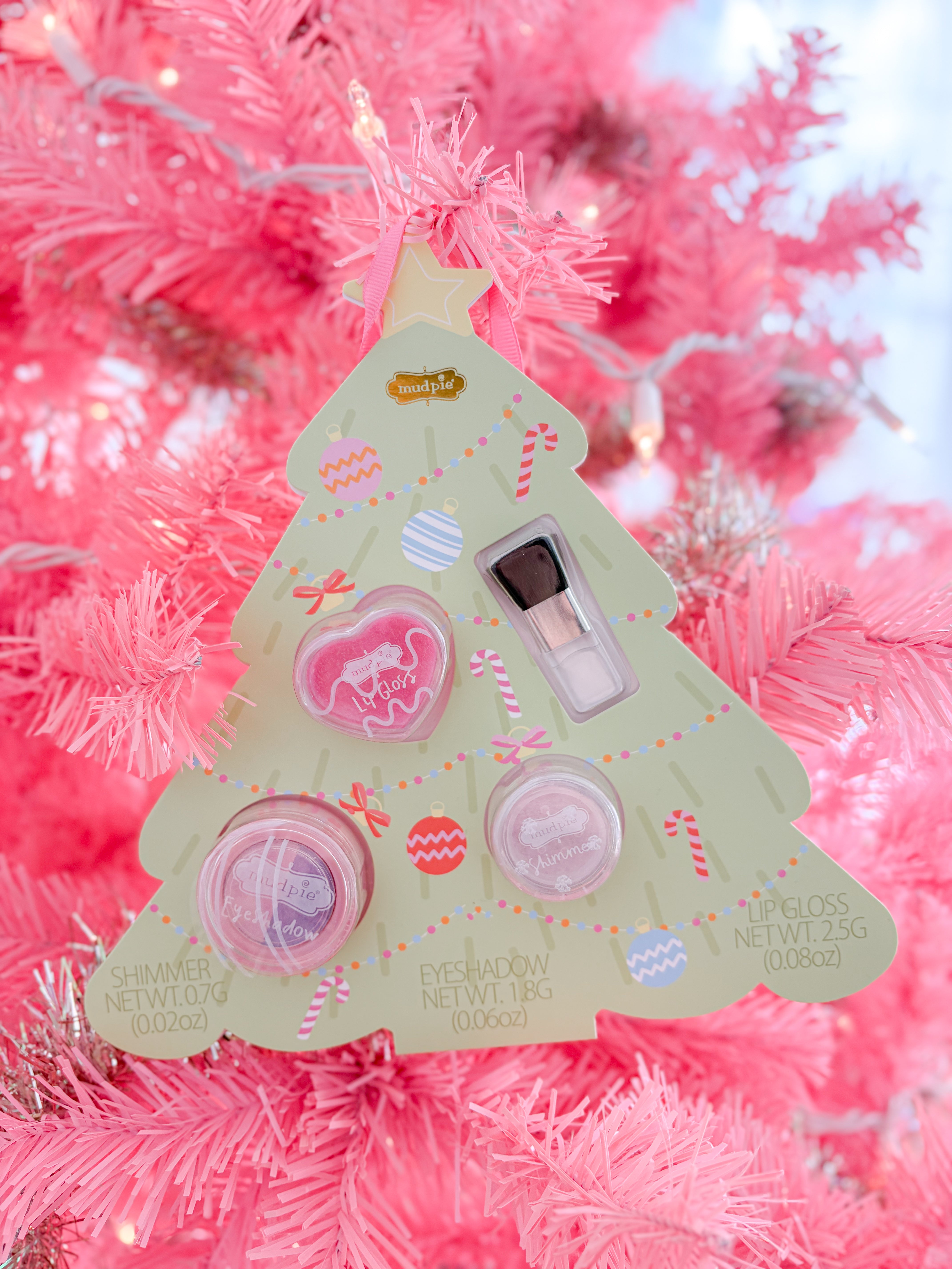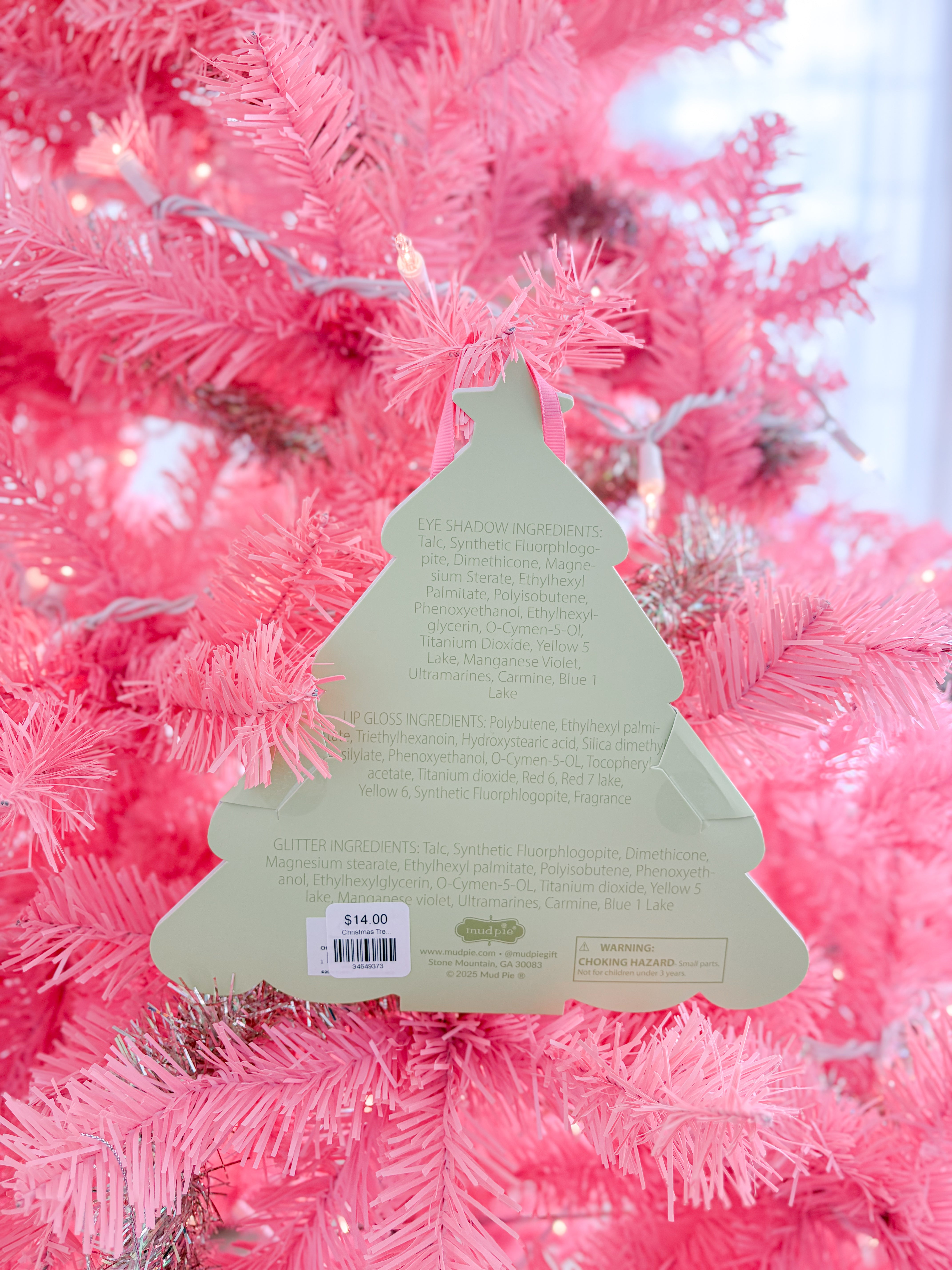 Delight in the festive spirit with this charming Christmas Tree Mini Makeup Set, perfect for young beauty enthusiasts. This 4-piece collection includes playful eyeshadow, vibrant lip gloss, dazzling shimmer glitter, and a handy makeup brush, all designed to inspire creativity and fun. The set is beautifully presented in a unique figural display packaging, complete with a ribbon loop hanger for easy display or gifting. Ideal for ages 3 and up, this set measures 9" x 5 3/4" and is crafted from durable plastic, ensuring safe and enjoyable use. Perfect for holiday gifting or as a delightful stocking stuffer, this mini makeup set brings joy and sparkle to any occasion.