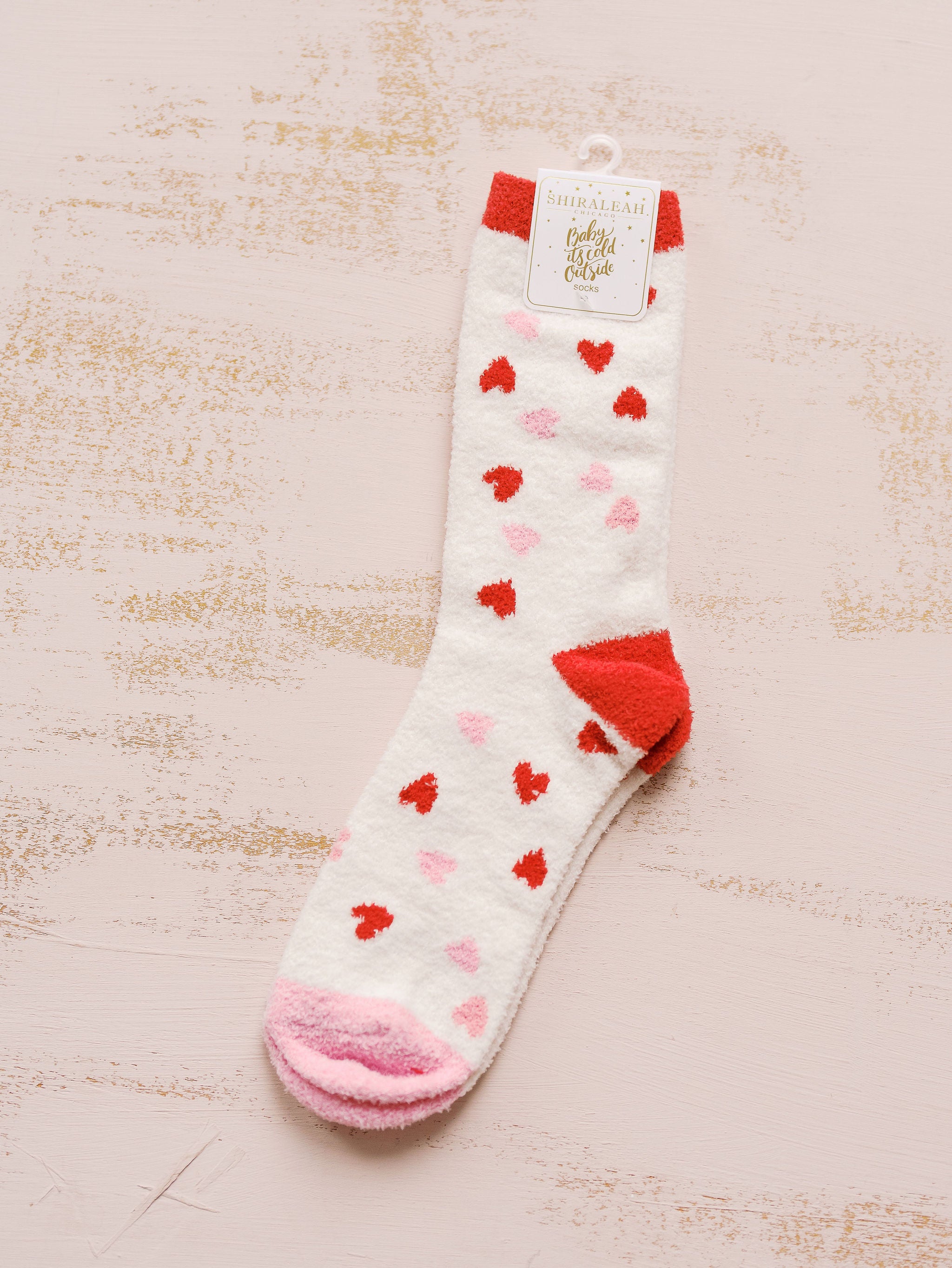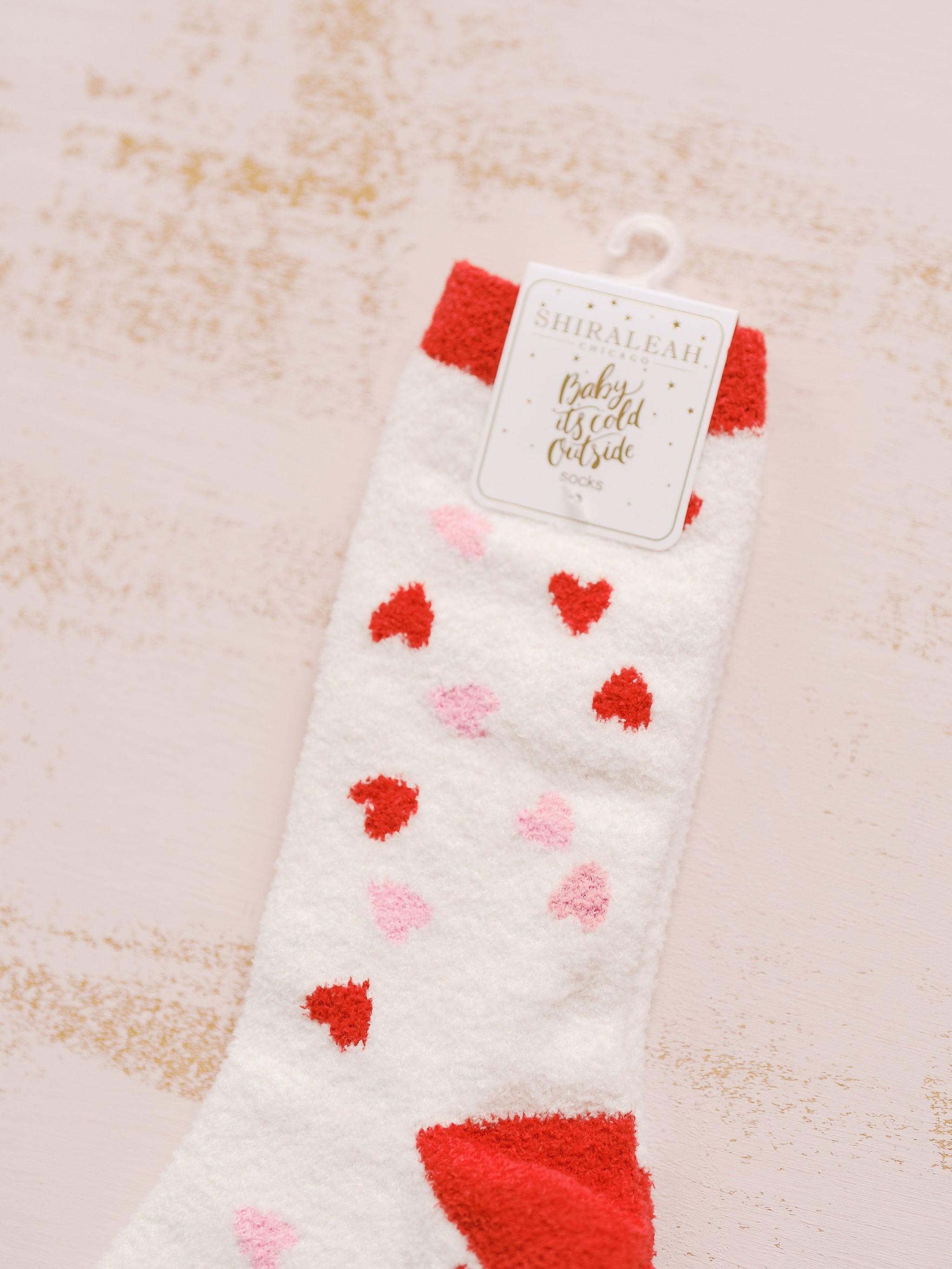 Fits size 5-11Made from polyester and spandex, Step into sweetness with our Candy Heart Socks, the coziest way to show your love from the toes up. These fuzzy crew socks feature a soft ivory base scattered with playful pink and red hearts and finished with vibrant red accents at the toe, heel, and cuff. Made with an ultra-soft material, they’re the perfect pair for lounging, gifting, or just adding a little love to your look. Whether you're treating yourself or surprising someone special, these socks are pure heart-eyed happiness.