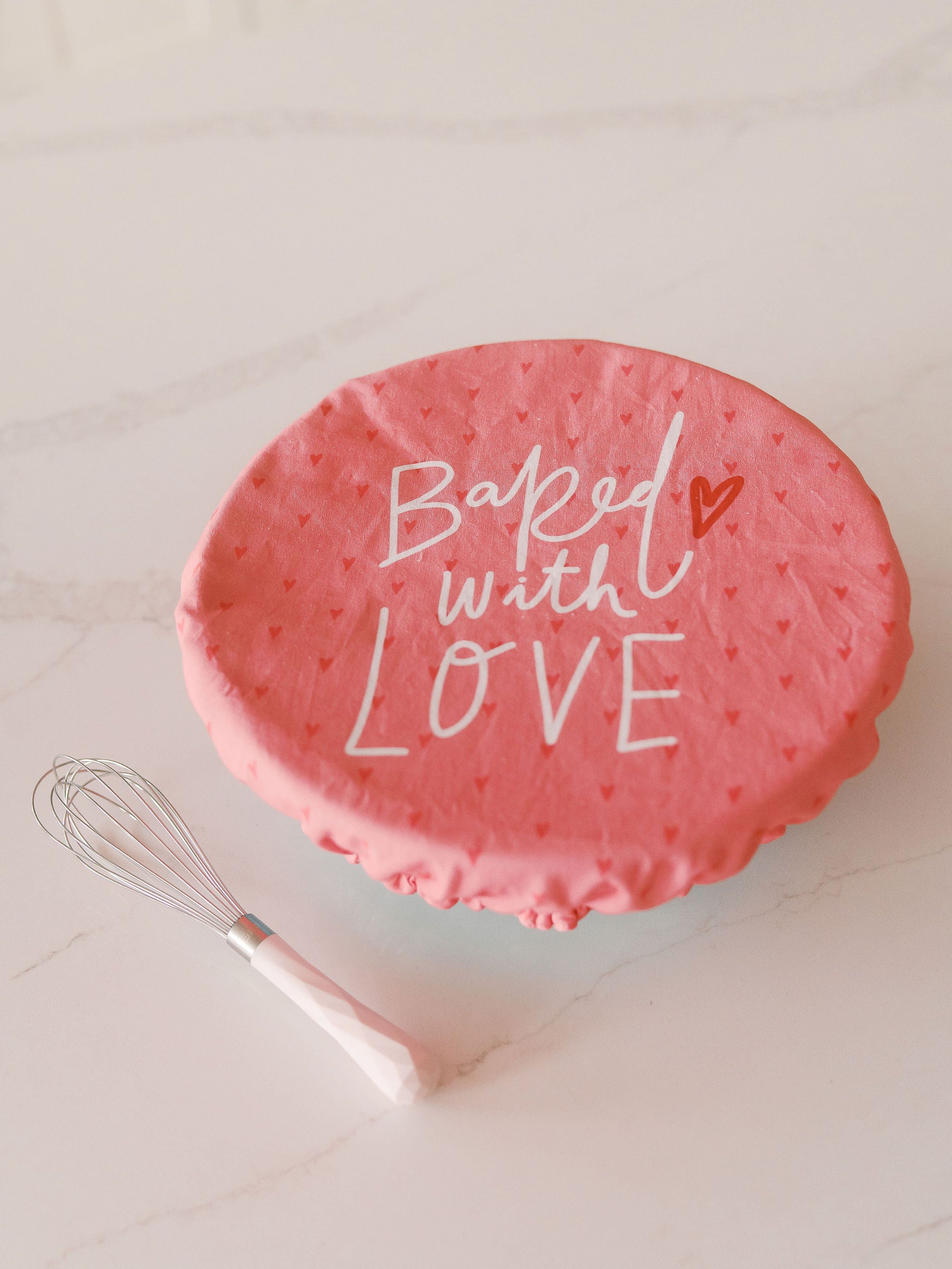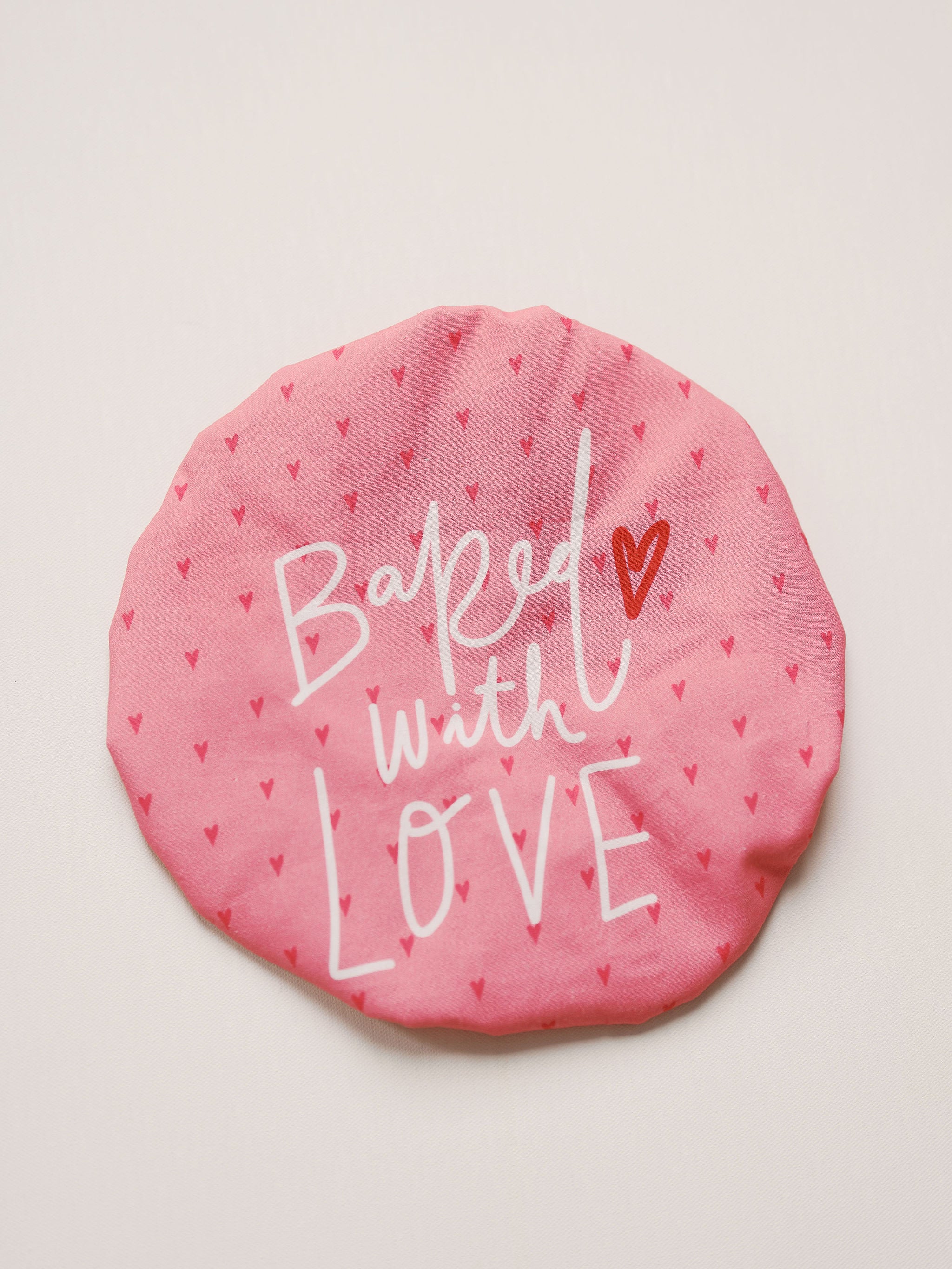 Keep baked goodness cozy with this pink reusable bowl cover printed with Baked with LOVE and tiny hearts. Stretchy, washable fabric seals in warmth and charm — perfect for rising dough, leftovers, or gifting fresh cookies. Eco-friendly and adorable, it swaps single-use wrap for a pinch of cutesy.