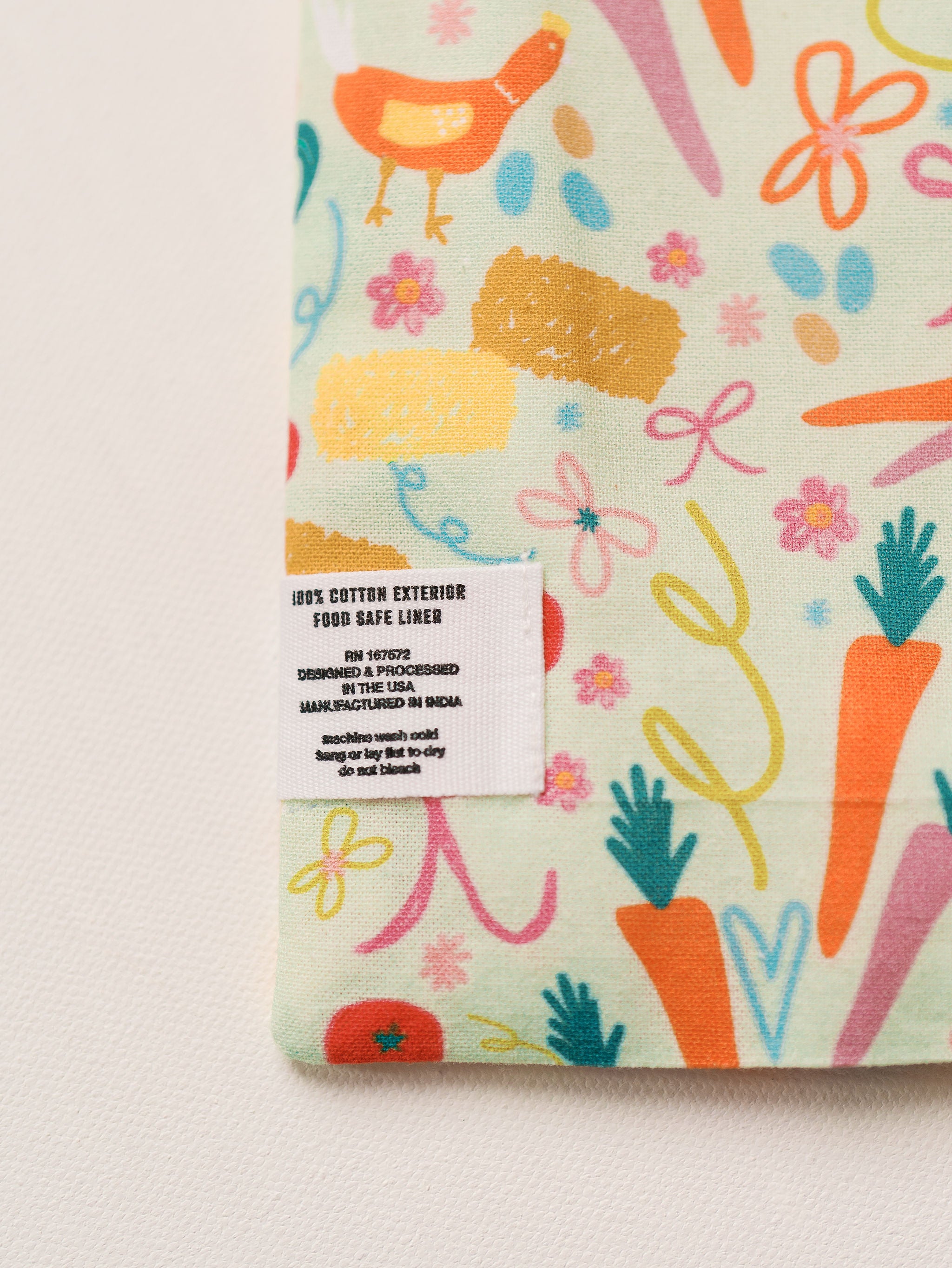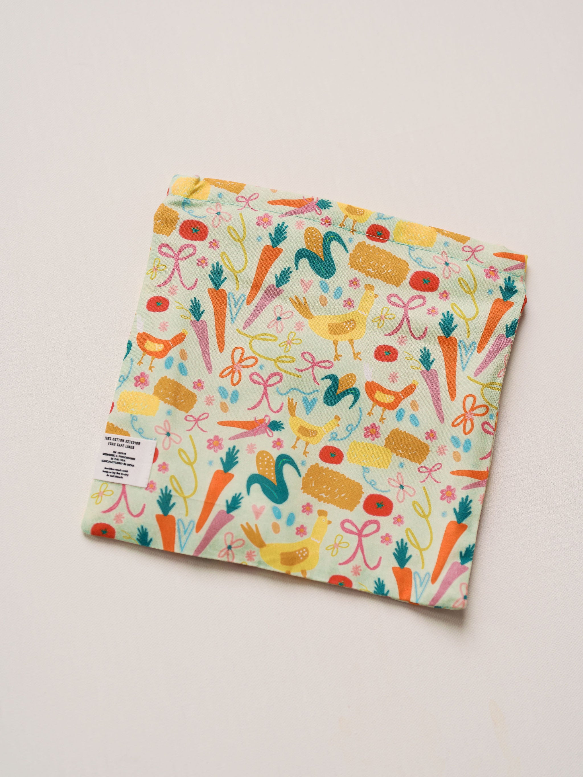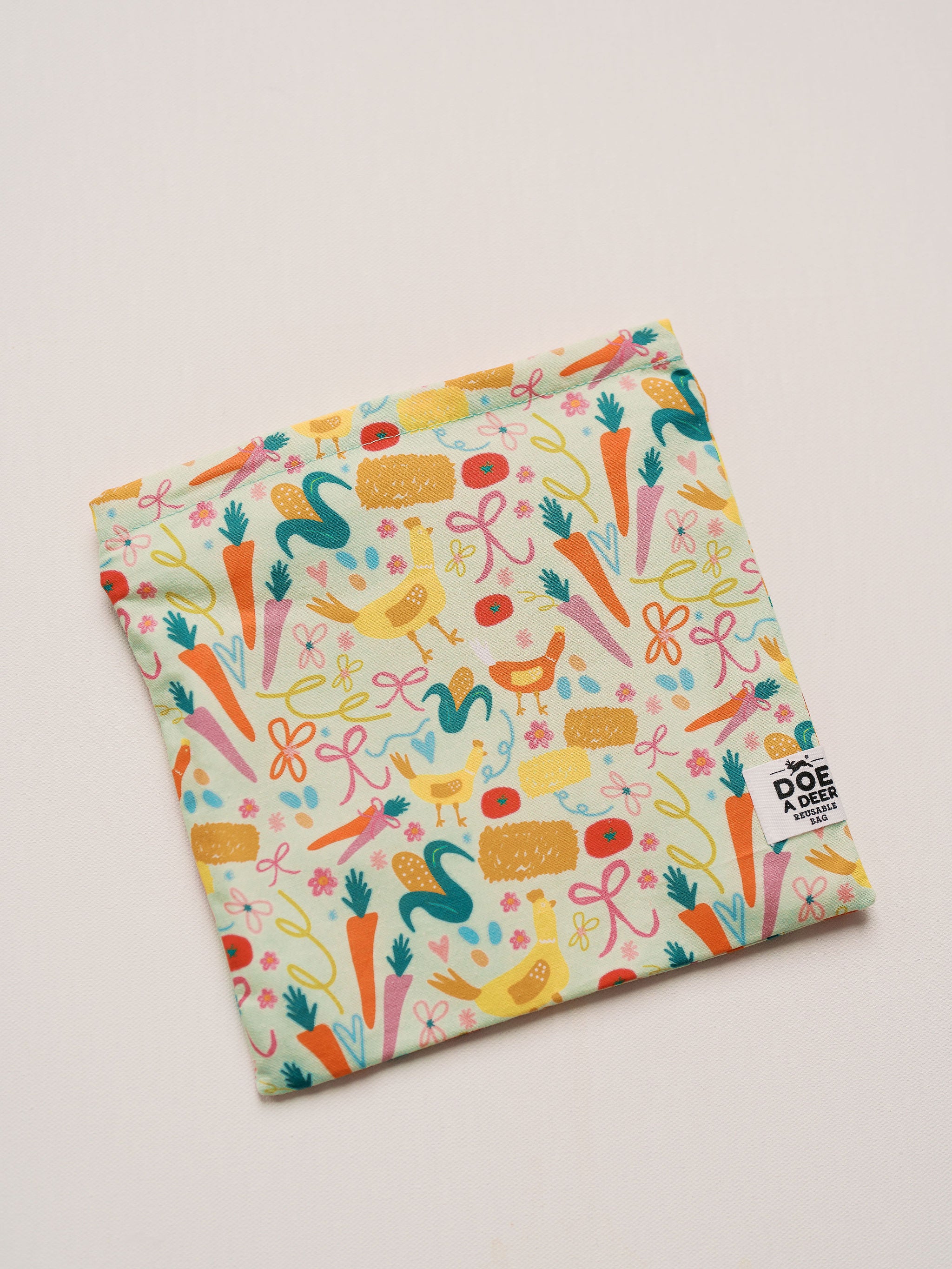 Designed to make snack time feel special, this reusable snack bag features a colorful garden-inspired print full of chickens, carrots, hay bales and cheerful details. Lightweight yet durable, it’s lined with a food-safe interior that wipes clean with ease—making it a favorite for busy days, little hands, and anyone who loves cute organization.