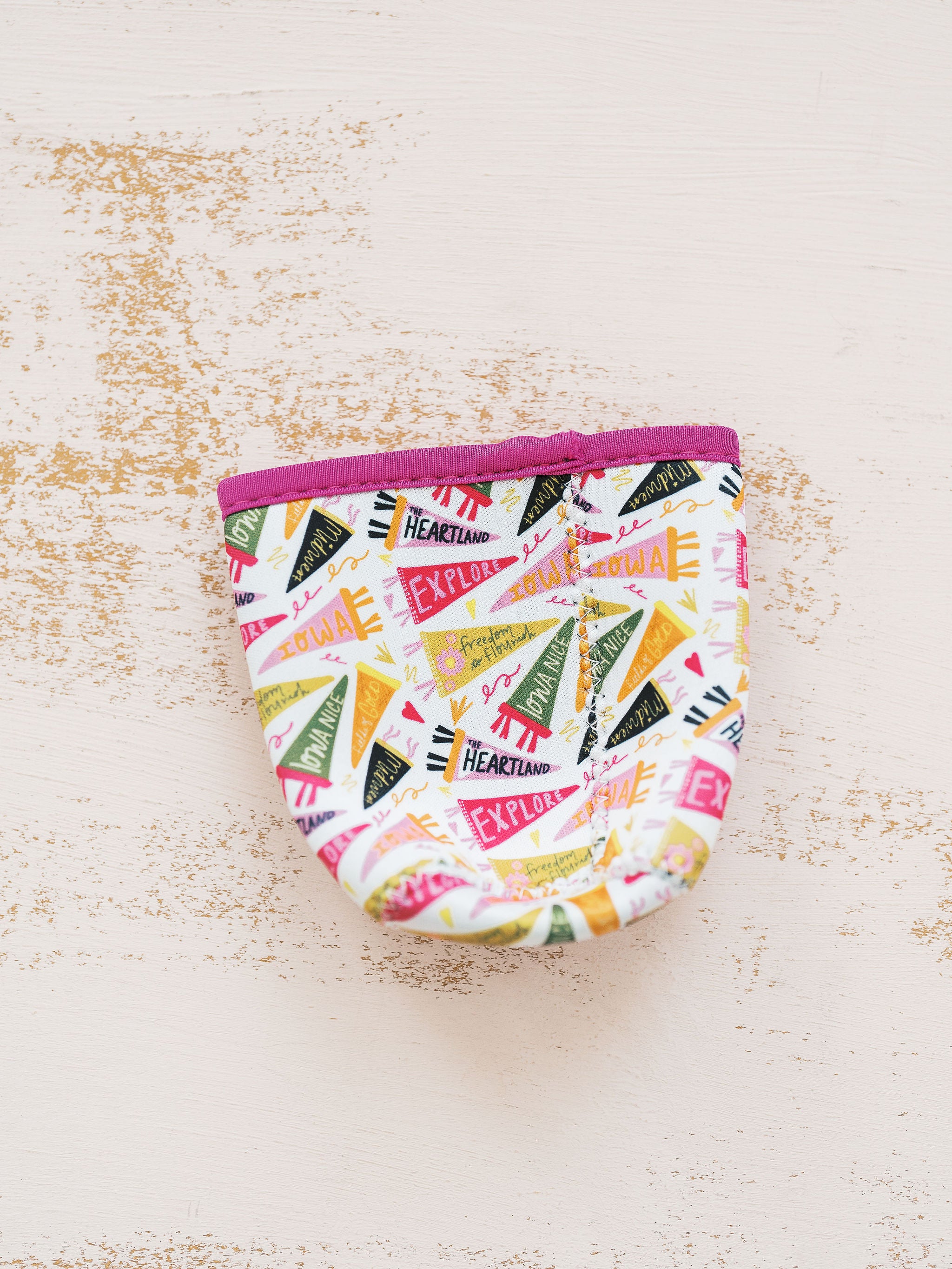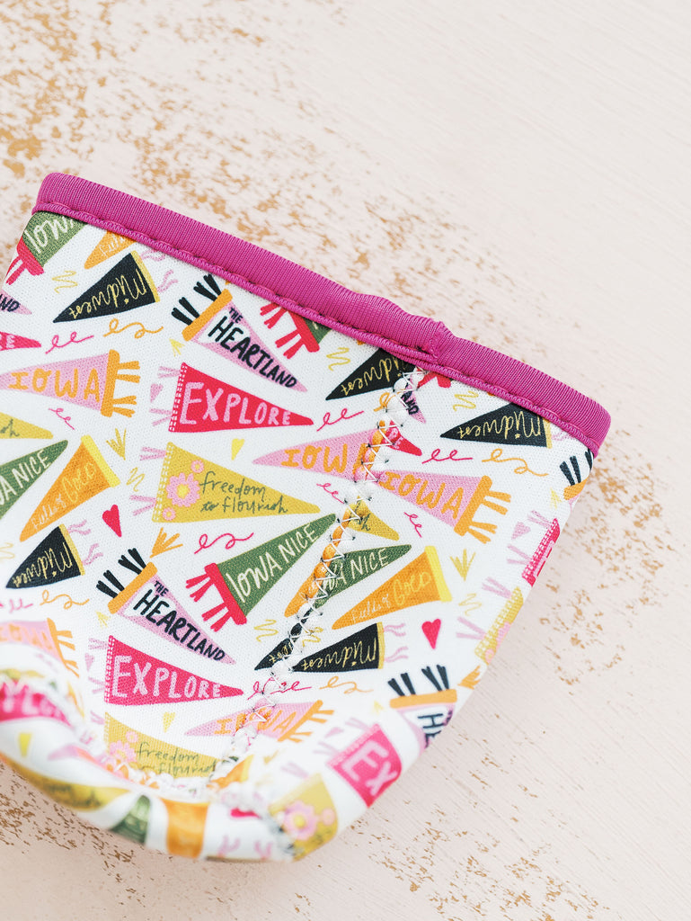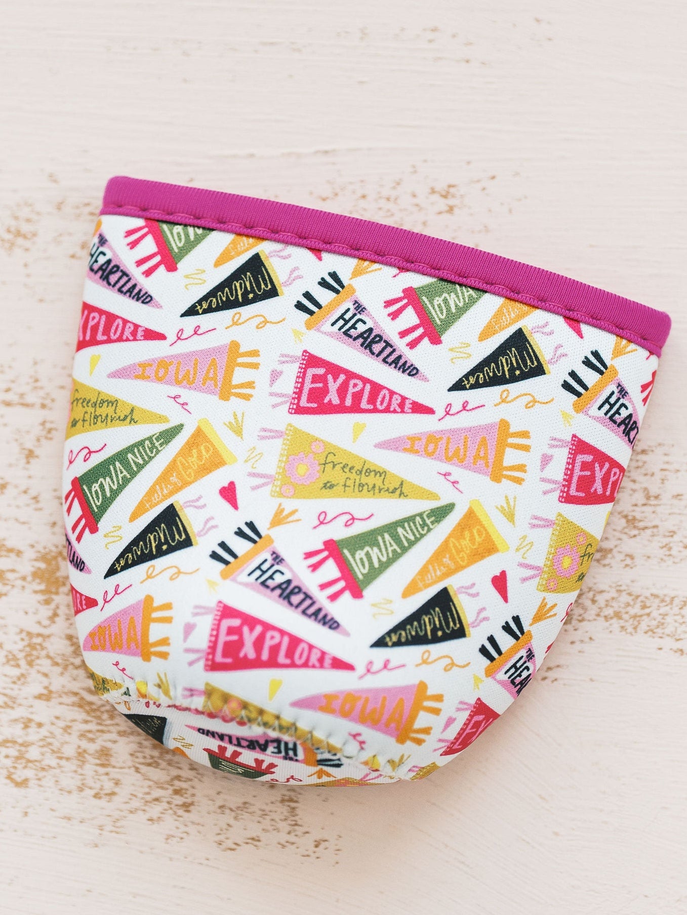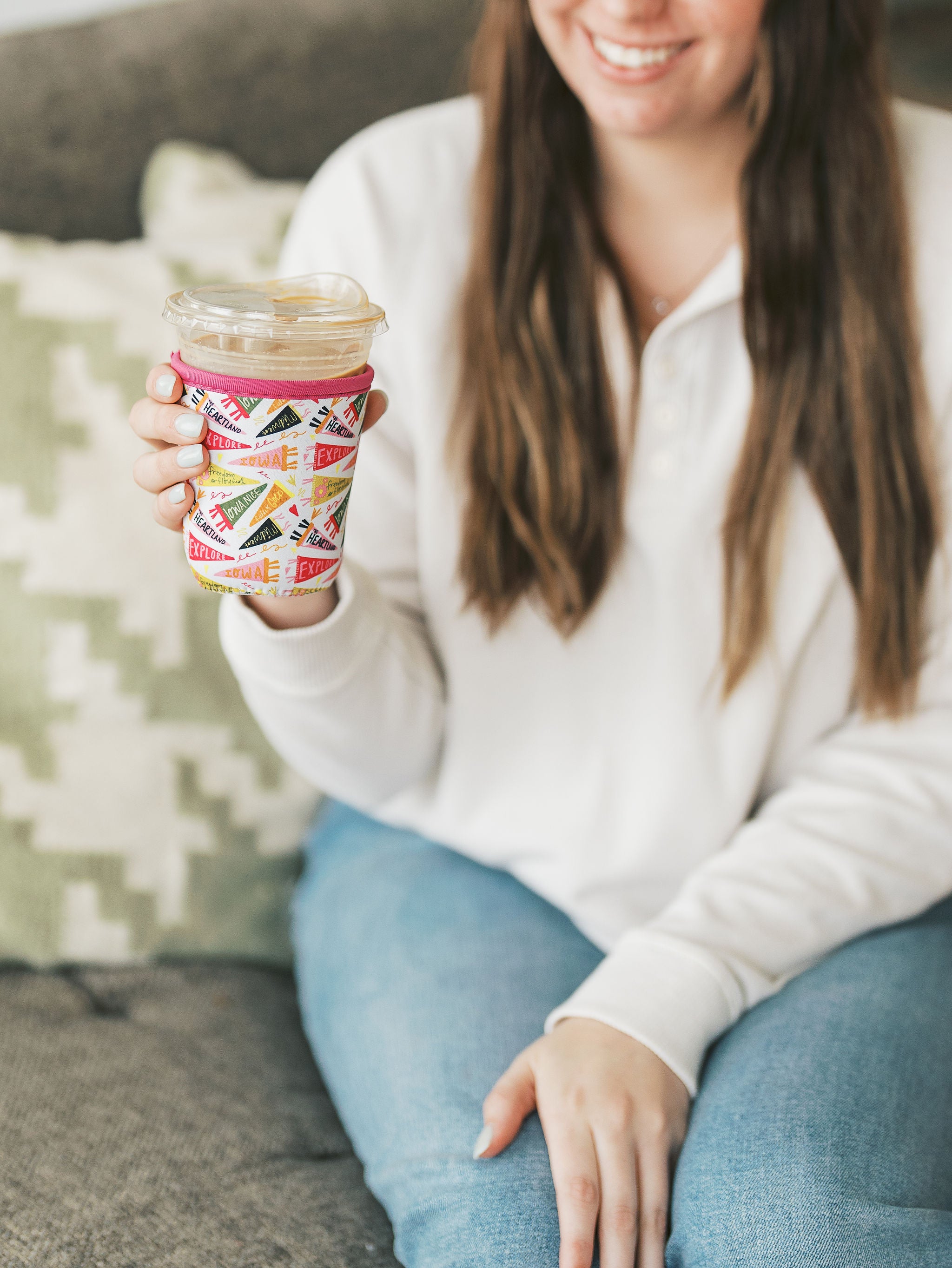| Keep your hands cool and your heart warm with this spirited little sleeve! Wrapped in Iowa pride and peppered with pennants like Explore and Fields of Gold, it’s the perfect companion for iced coffees & other cold drinks and road trips through the cornfields. A cozy grip with a side of heartland charm—sip by sip. Fits 12-16 oz. beverages perfectly! Neoprene |