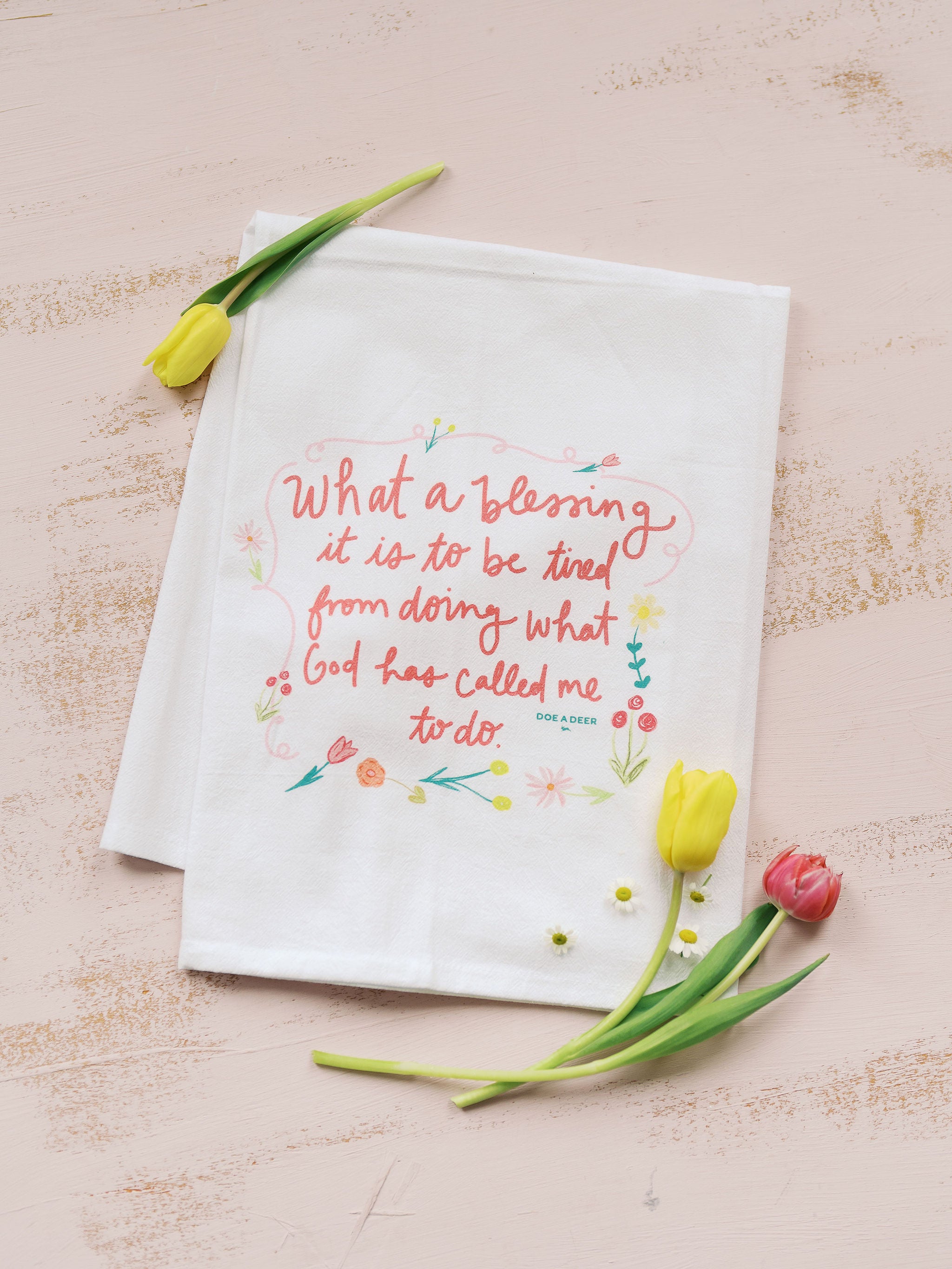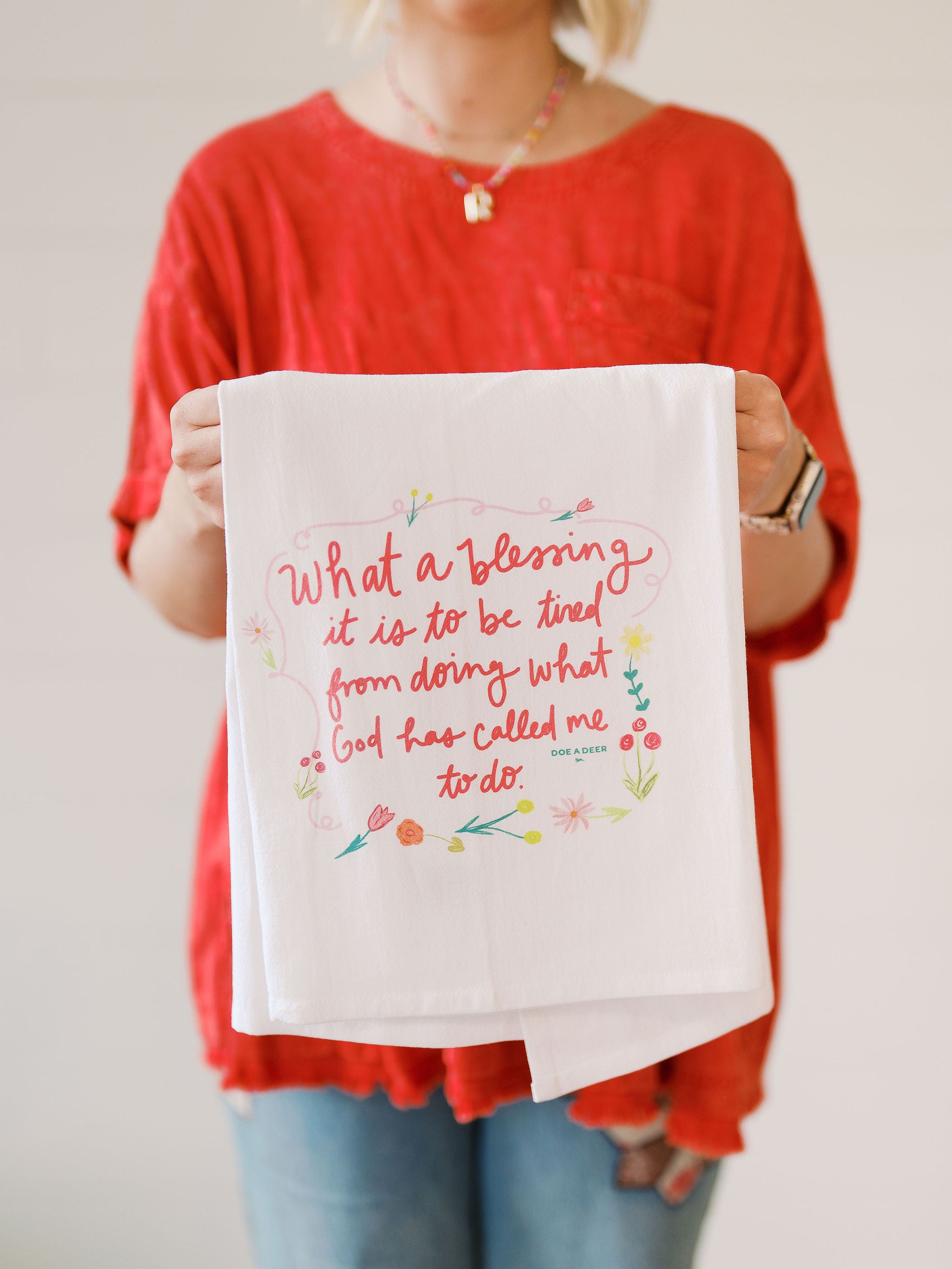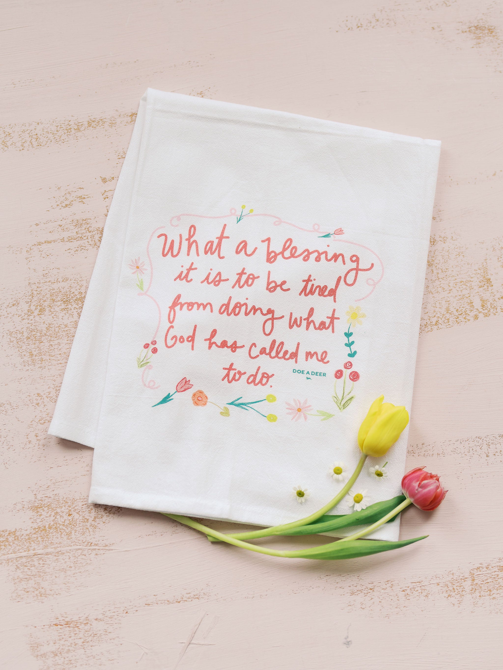 Celebrate the beautiful kind of tired—the kind that comes from pouring your heart into what God has called you to do. This charming flour sack towel features hand-drawn florals and an uplifting message that brings warmth, grace, and a little encouragement to every kitchen. Ultra-absorbent, soft, and made for daily use, it’s a sweet reminder that the work you do matters.
