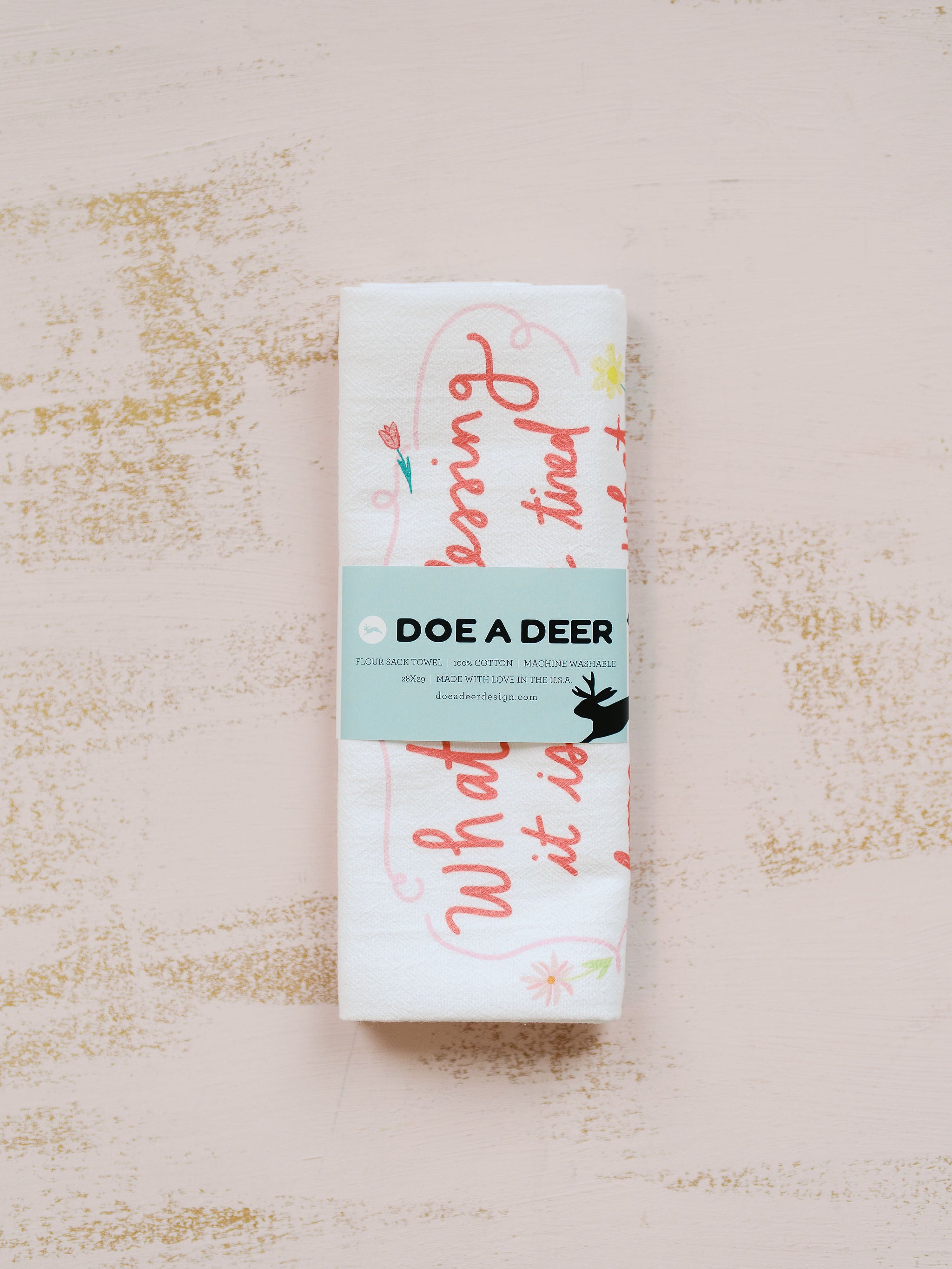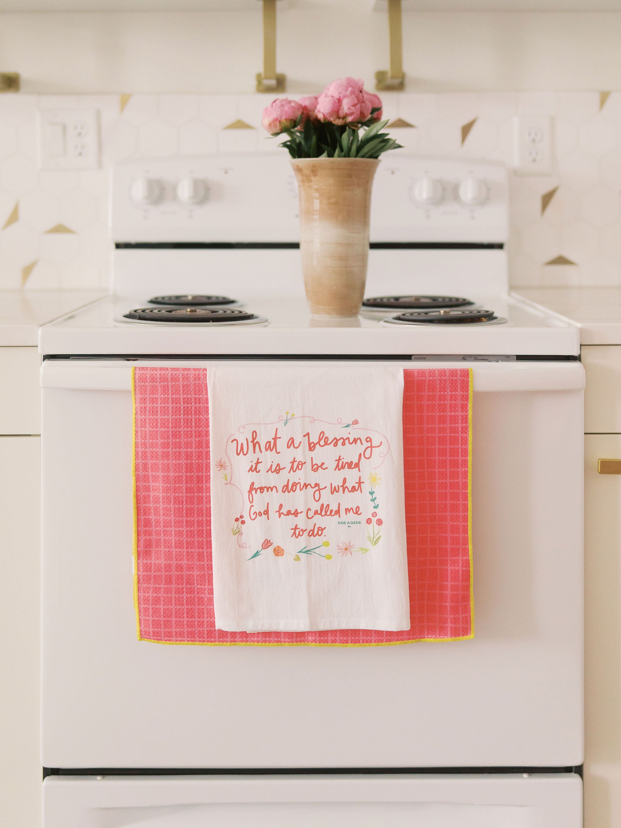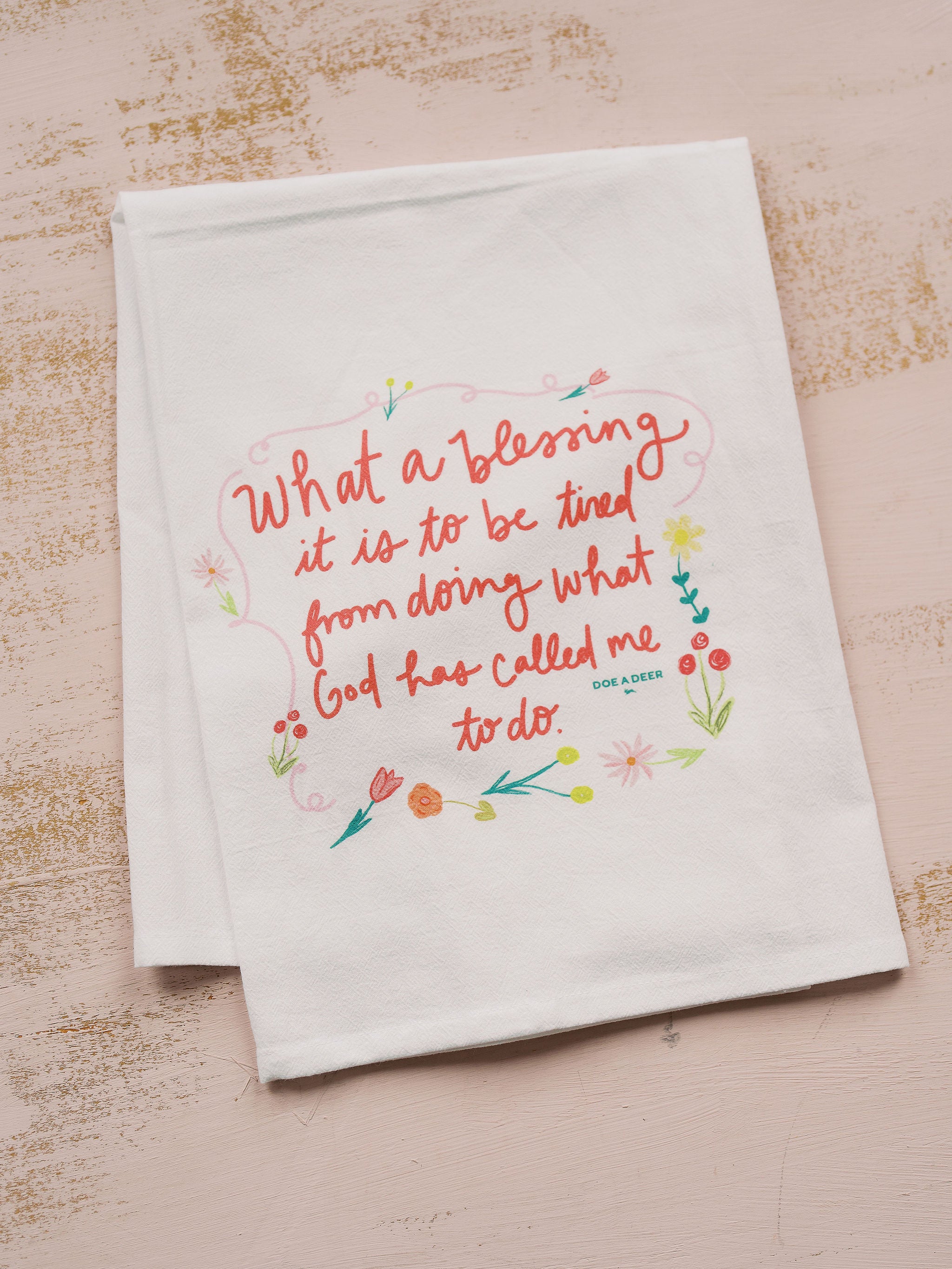 Celebrate the beautiful kind of tired—the kind that comes from pouring your heart into what God has called you to do. This charming flour sack towel features hand-drawn florals and an uplifting message that brings warmth, grace, and a little encouragement to every kitchen. Ultra-absorbent, soft, and made for daily use, it’s a sweet reminder that the work you do matters.
