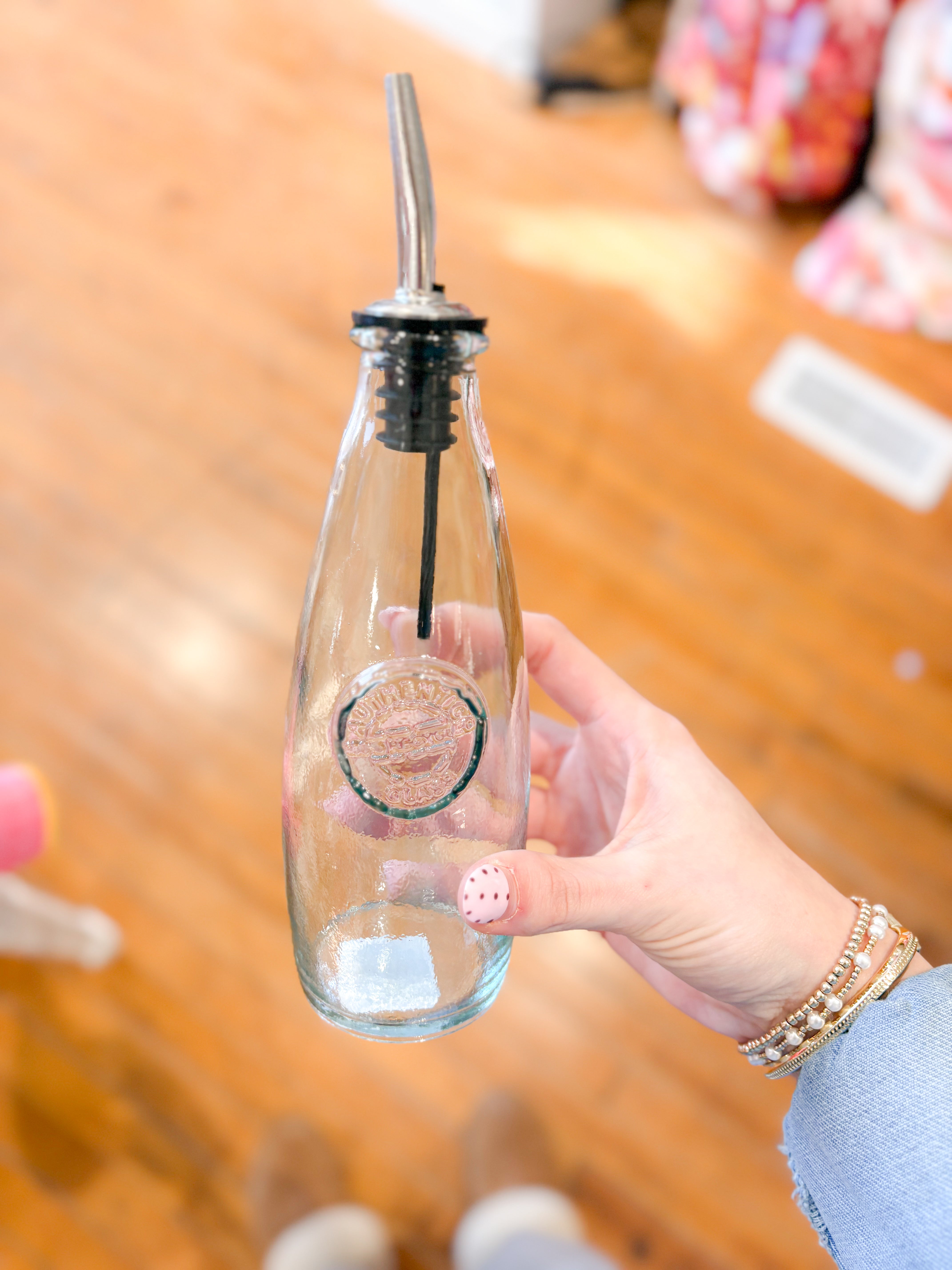 Beautifully crafted from recycled green-tint glass and made in Spain, this 12 oz glass dispenser adds a touch of timeless charm to any tabletop. The classic design offers both style and functionality, making it perfect for home kitchens.