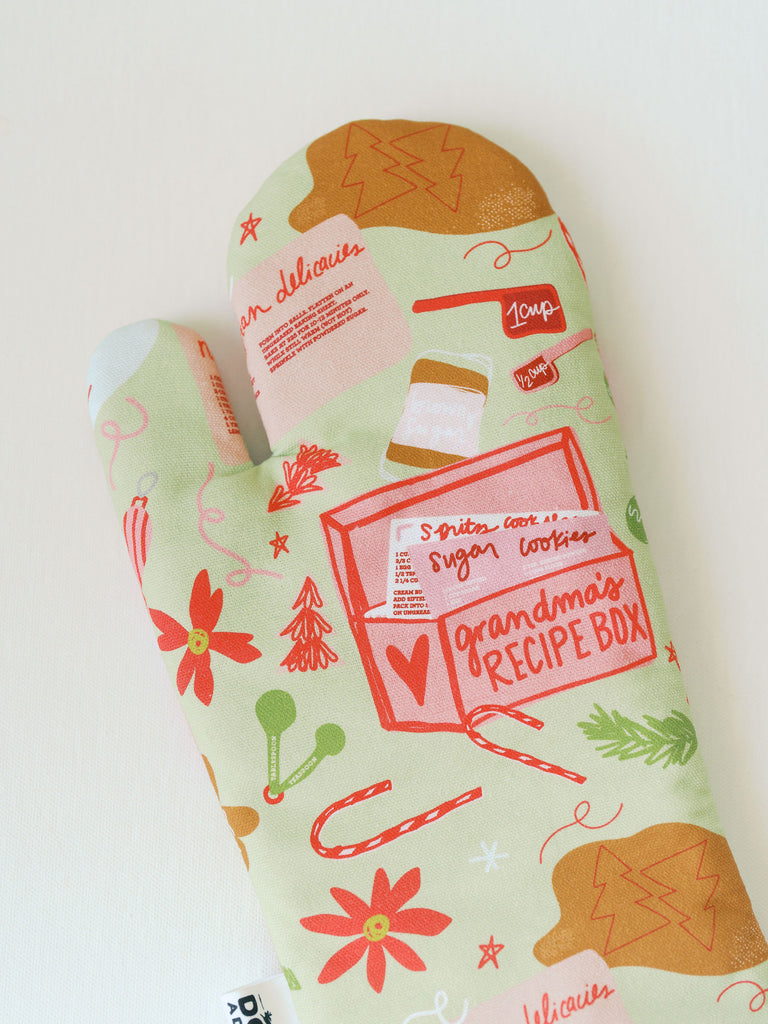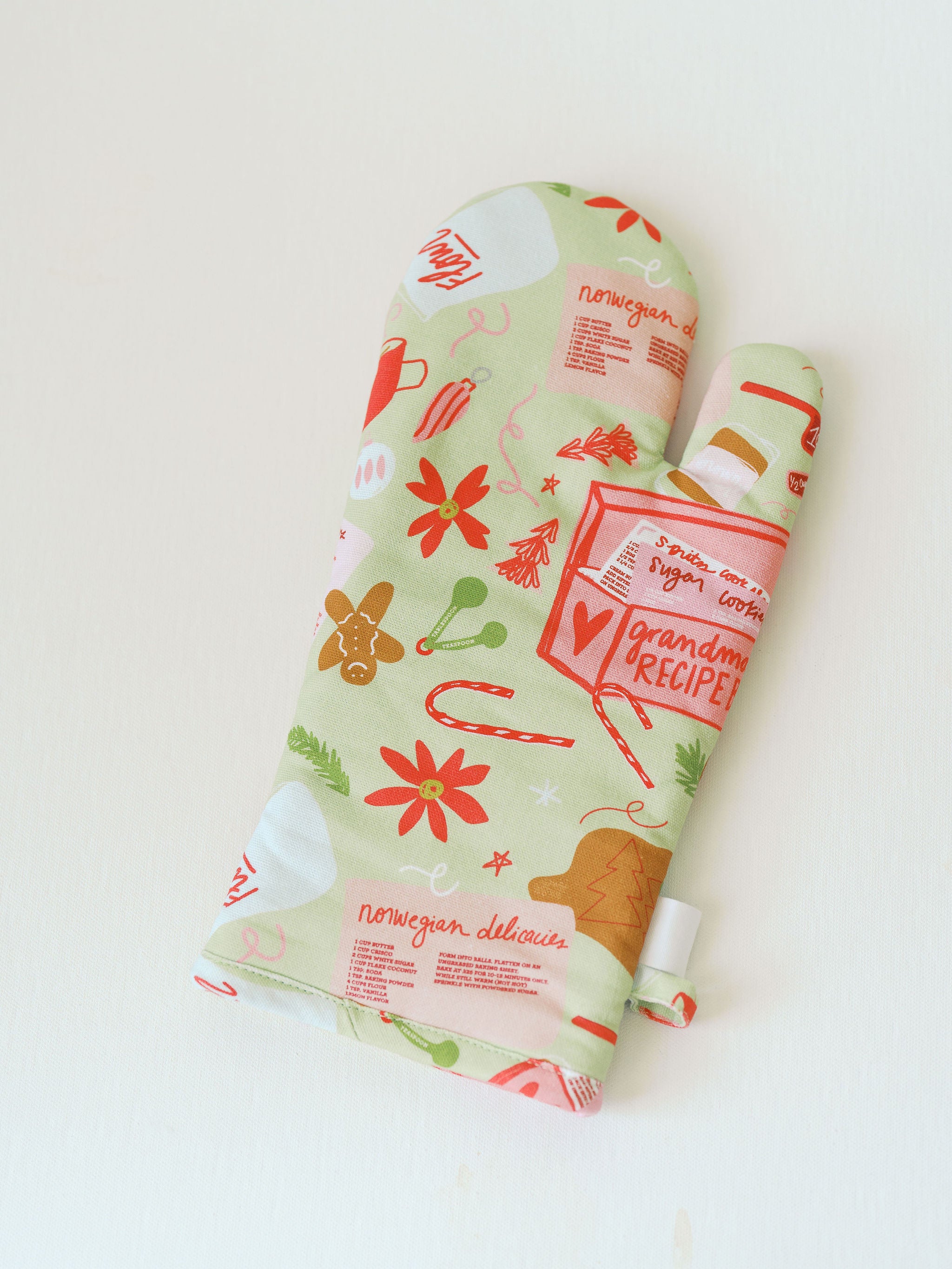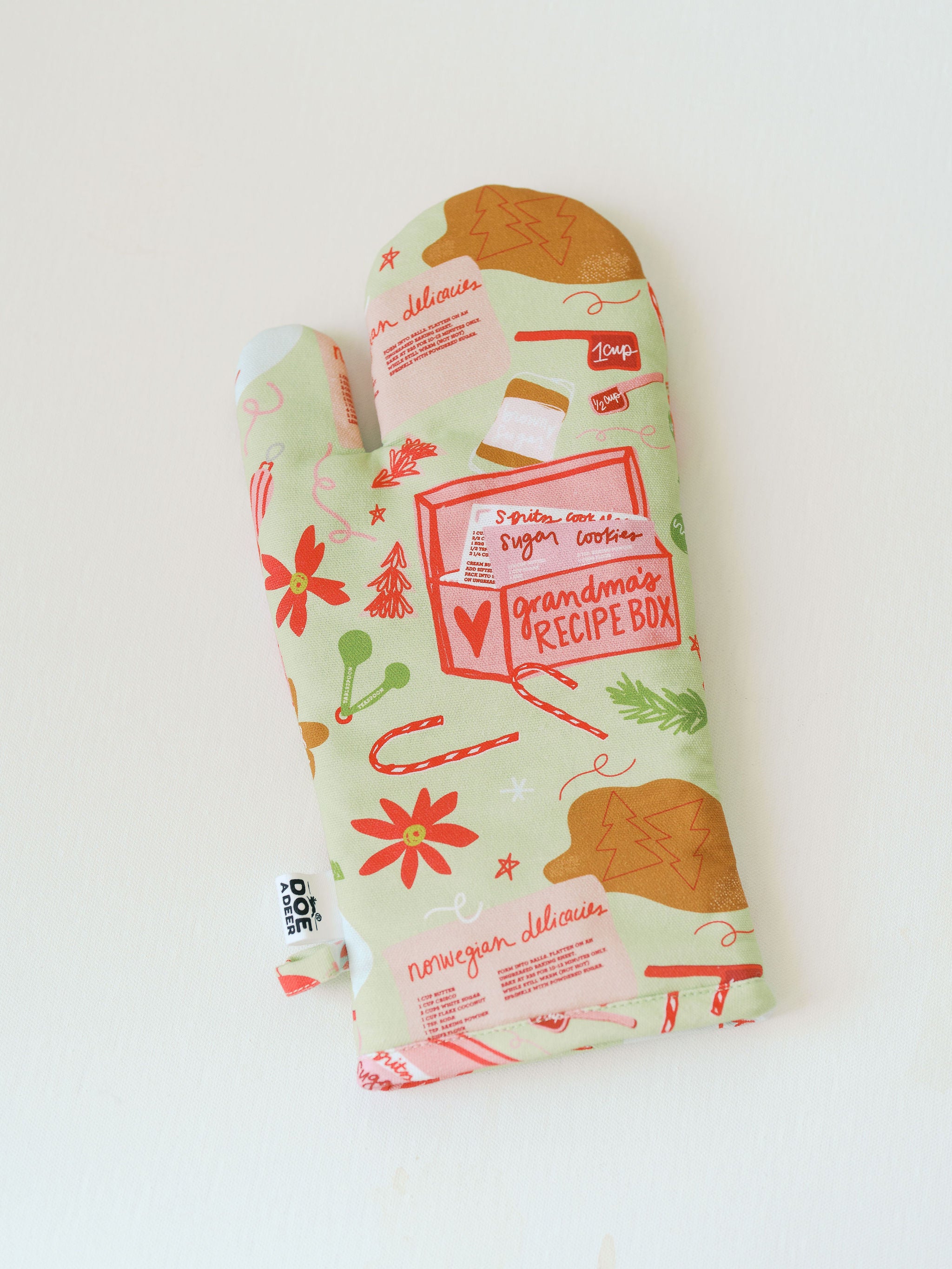 Pull your favorite holiday bakes from the oven with a mitt full of memories! Our Heirloom Baking Oven Mitt features a charming print of handwritten recipe cards, candy canes, cookie cutters, and cozy kitchen details—all inspired by generations of Christmas baking traditions.