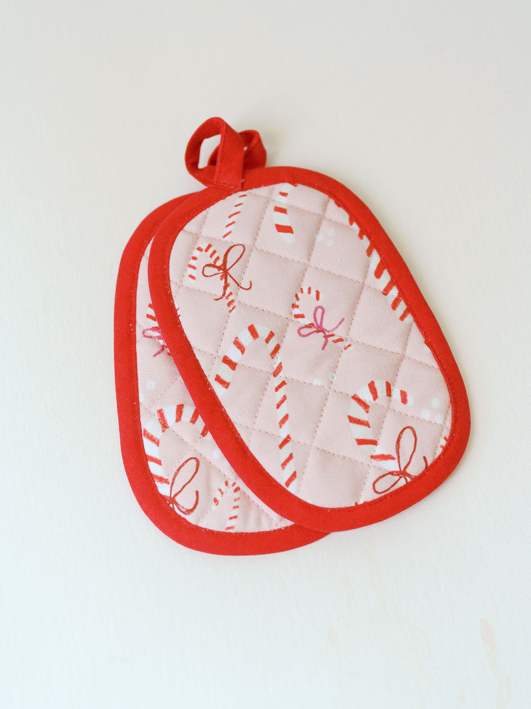 Our Candy Cane Mini Mitts are the cutest way to protect your hands while pulling warm cookies from the oven or reheating leftovers. With its festive pink print sprinkled in candy canes (some topped with sweet little bows!) These mitts add a cheerful pop to all your kitchen moments.
