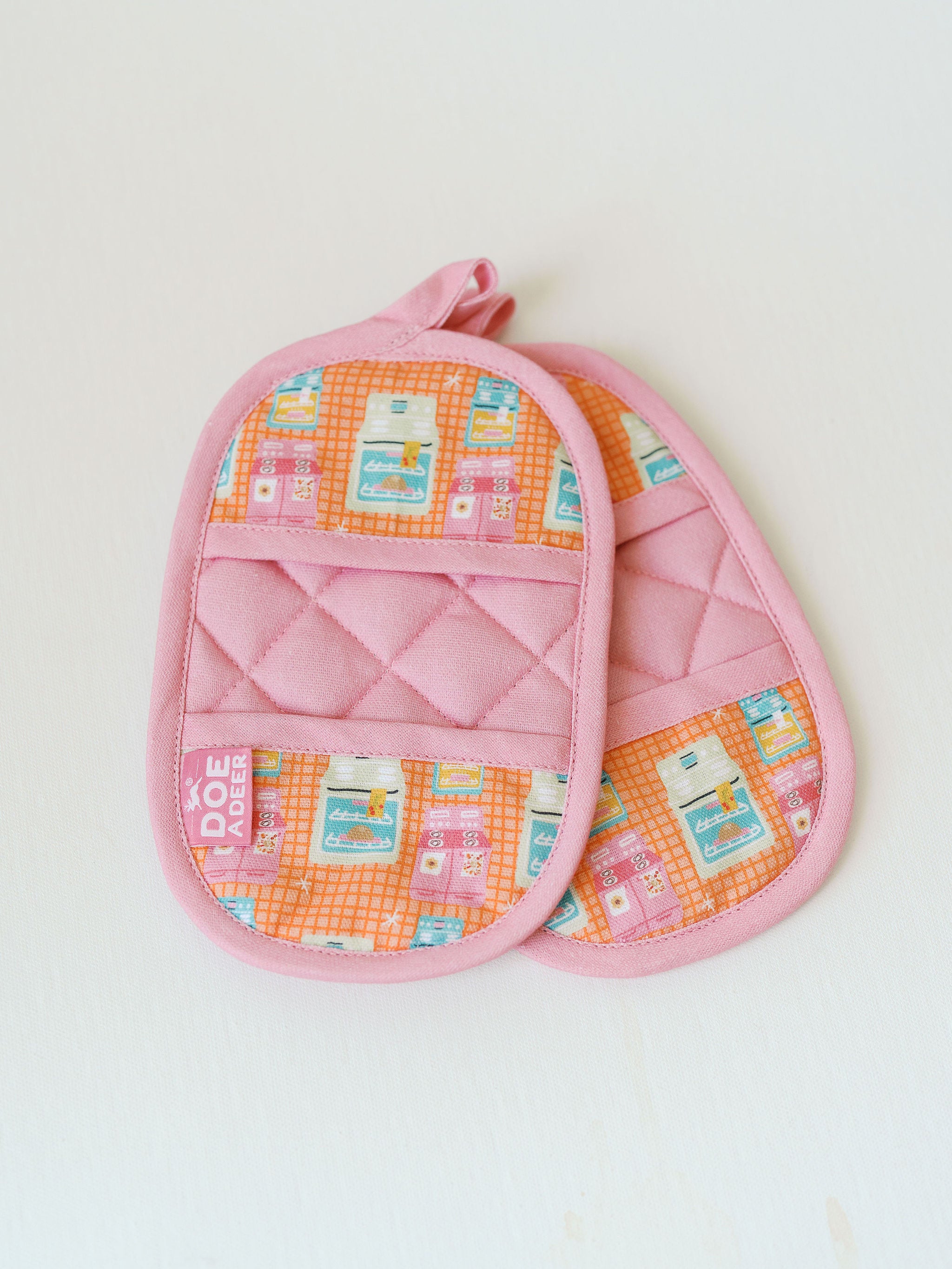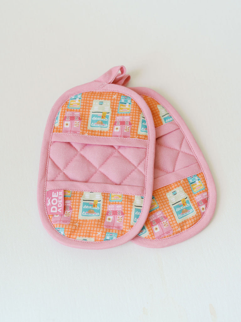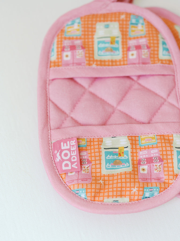 Small but mighty! These Vintage Ovens mini mitts are perfect for grabbing cookie sheets, toaster trays, or hot handles. Designed to fit adult hands comfortably, they feature an insulated layer for heat protection and a loop for easy hanging. The playful oven print adds a dash of nostalgia to every kitchen task.