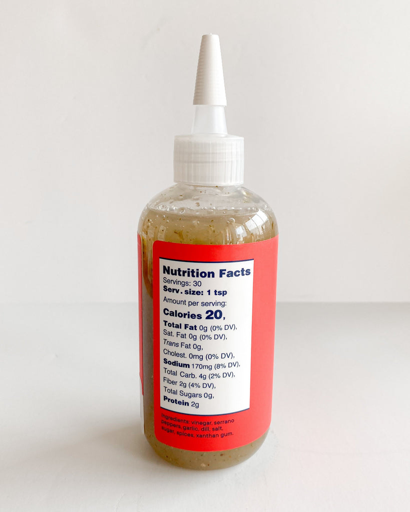 We combine fresh chopped Dill & Garlic with our famous National Award Winning pickle brine and secret spice blend to create this amazing hot sauce. Great on anything from bbq, fried chicken, eggs, sandwiches, and grilled vegetables!