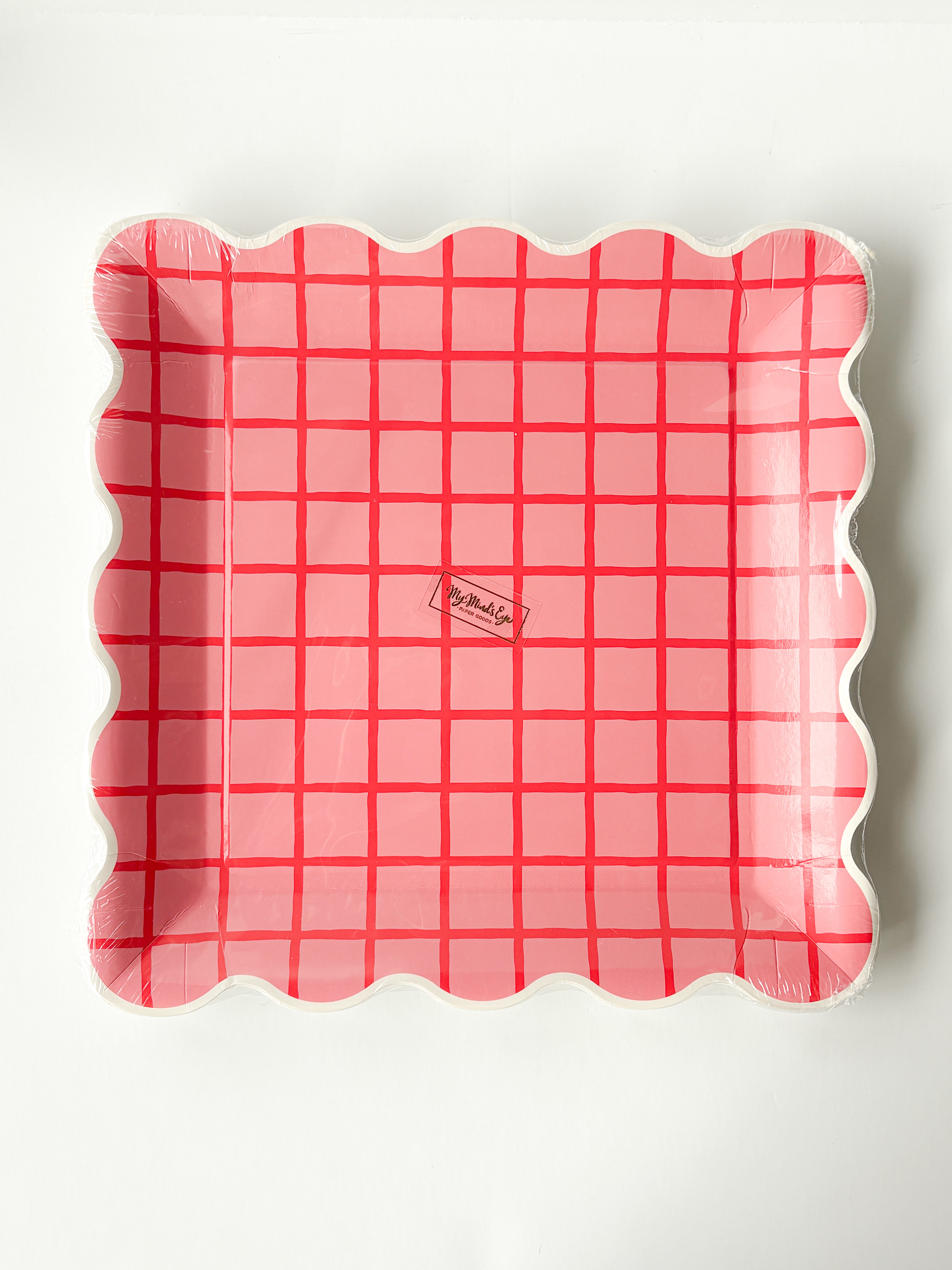 Add a splash of color to your party with the Red and Pink Grid Scallop Square Plate. Featuring a cheerful grid design in red and pink hues and charming scalloped edges, these plates bring a coordinated and festive vibe to your table. Perfect for serving snacks, desserts, or appetizers, they help create a lively atmosphere for any celebration.
