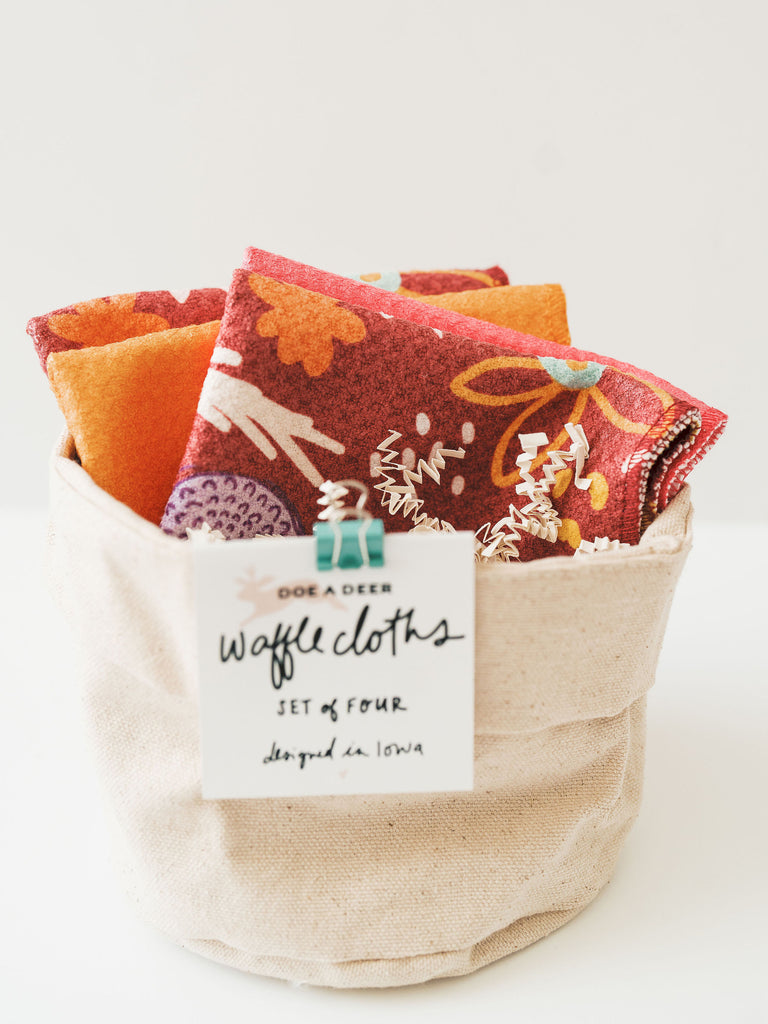Spice up your kitchen clean-up with a touch of fall flair! These textured wafflecloths are perfect for washing dishes after Sunday soup or wiping counters post-pie prep. Soft, absorbent, and bursting with autumn blooms—what’s not to love? Made from our ultra-absorbent waffle towel material, these cheery cloths are perfect for sprucing up cozy kitchens and autumn-ready bathrooms alike. Nestled in a charming, reusable canvas basket, they’re as delightful for fall gifting as they are for keeping. Whether it’s a housewarming treat or a “just because” surprise, these waffle cloths bring a little leaf-crunching joy to everyday chores.