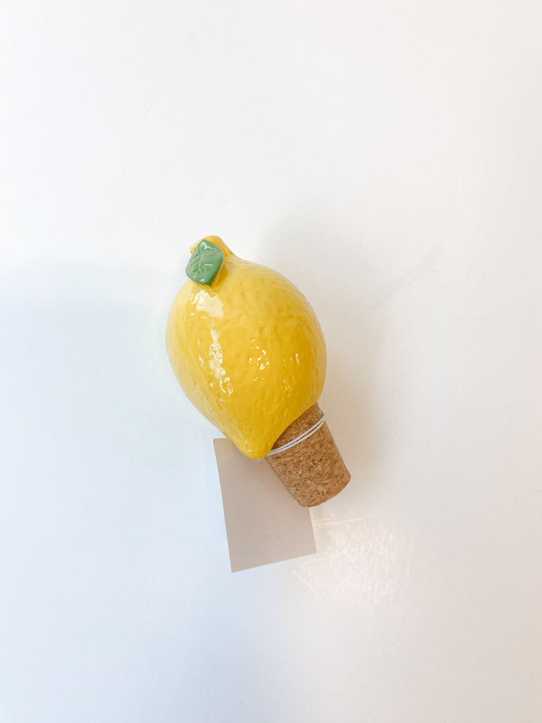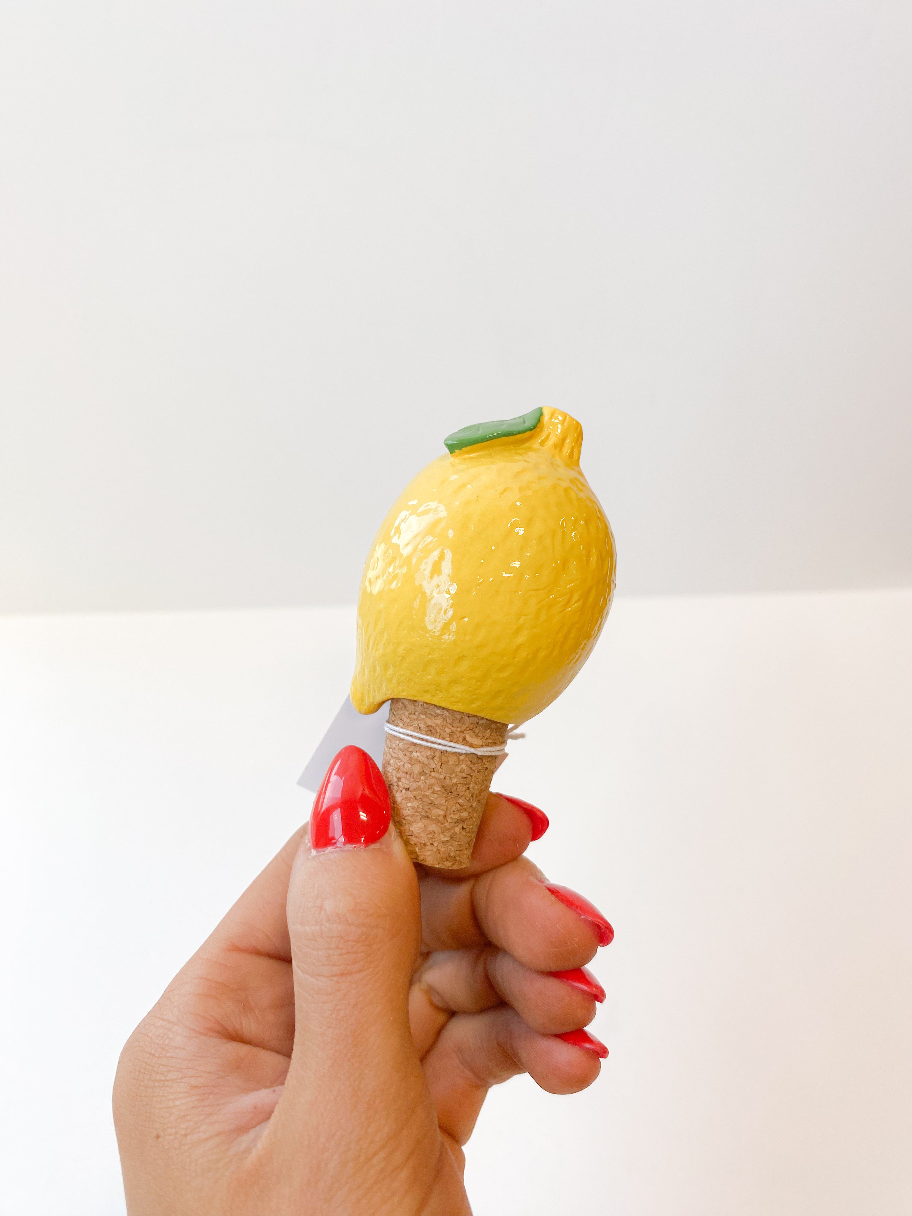 Made of shiny polyresin, this sweet stopper features a quirky yellow lemon shape with a textured peel-like surface and a tiny green leaf. The bottom of the stopper is made from cork and will slip easily into the neck of a bottle to seal your drink while also adding a fun decoration. Dimensions width 4.5cm x height 8cm Made from cork, polyresin