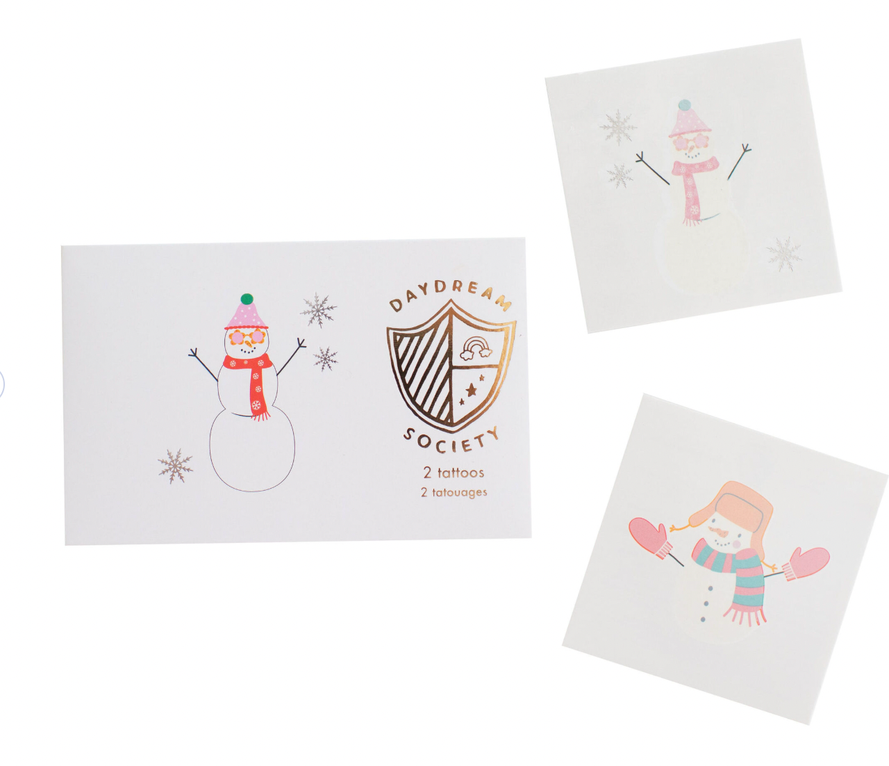 the cutest and jolliest buddies around! featuring a pastel color palette and shiny silver these tattoos make winter magic come to life, plus they're perfect for stuffing in a stocking or christmas party favor! pack of 2 tattoos (1 each of 2 designs) each tattoo measures 2.5 inches square safe + non-toxic packaged in a card stock envelope