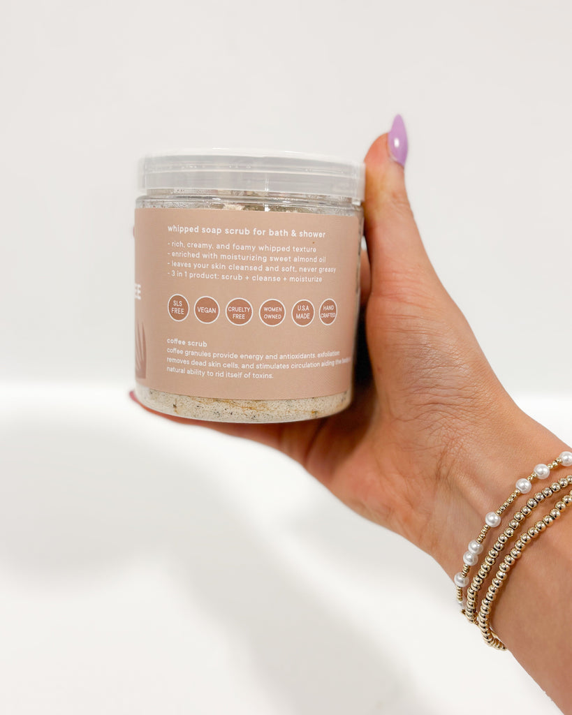🤎 Whipped soap scrub for bath & shower. This unique bath experience is a whipped, fluffy texture with exfoliating sugar grains that lather up, cleanse, scrub, and moisturize your skin - all in one jar! · rich, creamy, and foamy whipped texture · enriched with moisturizing sweet almond oil · leaves your skin cleansed and soft, never greasy · 3 in 1 product: scrub + cleanse + moisturize