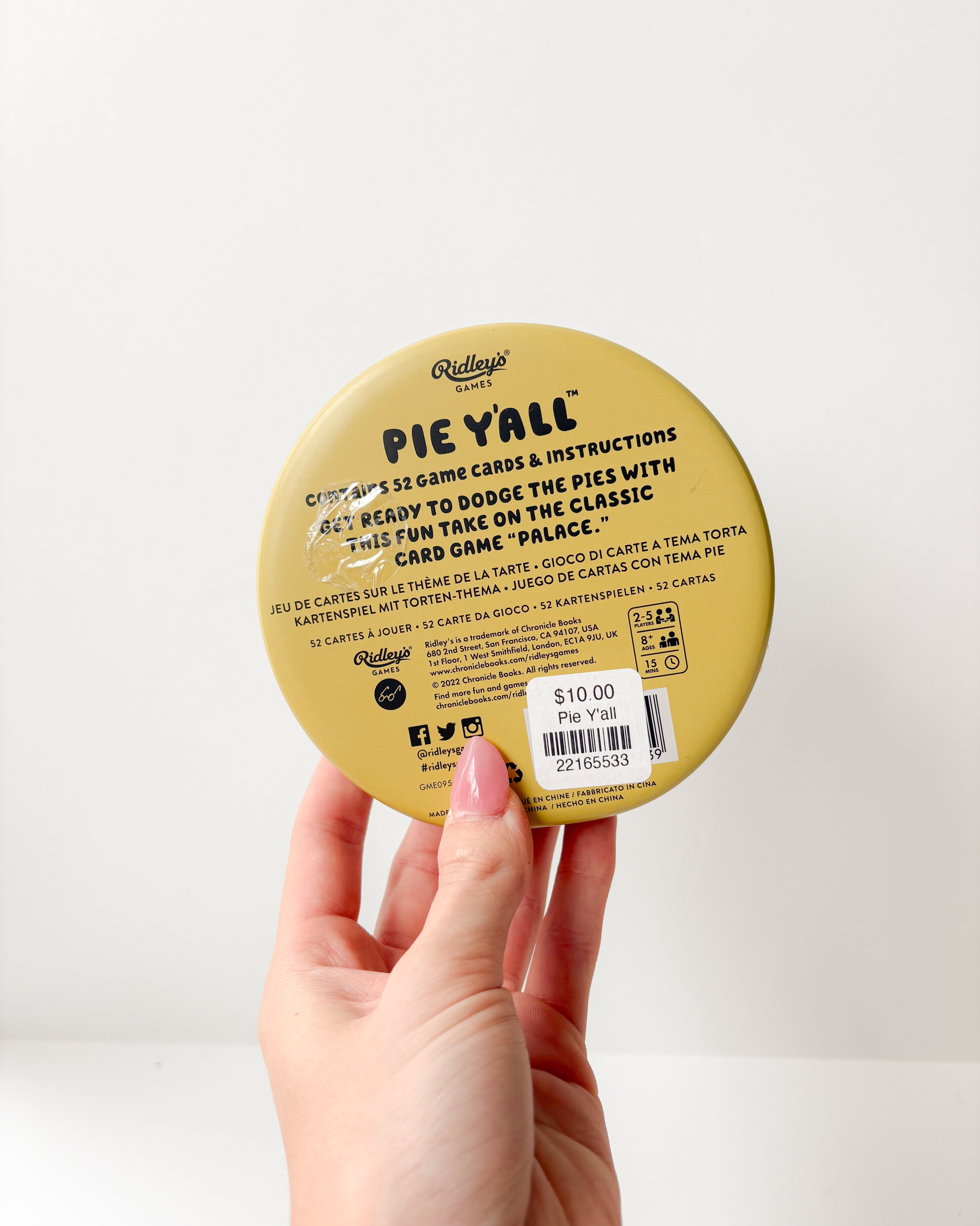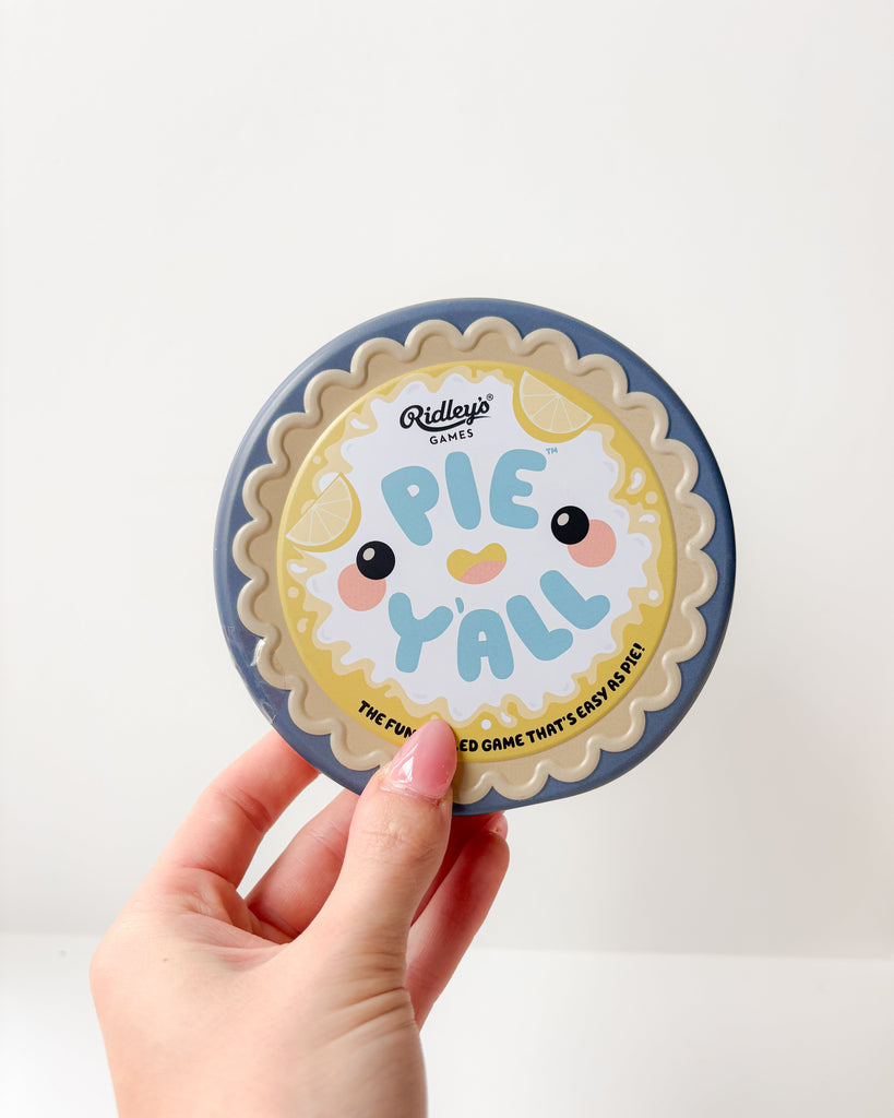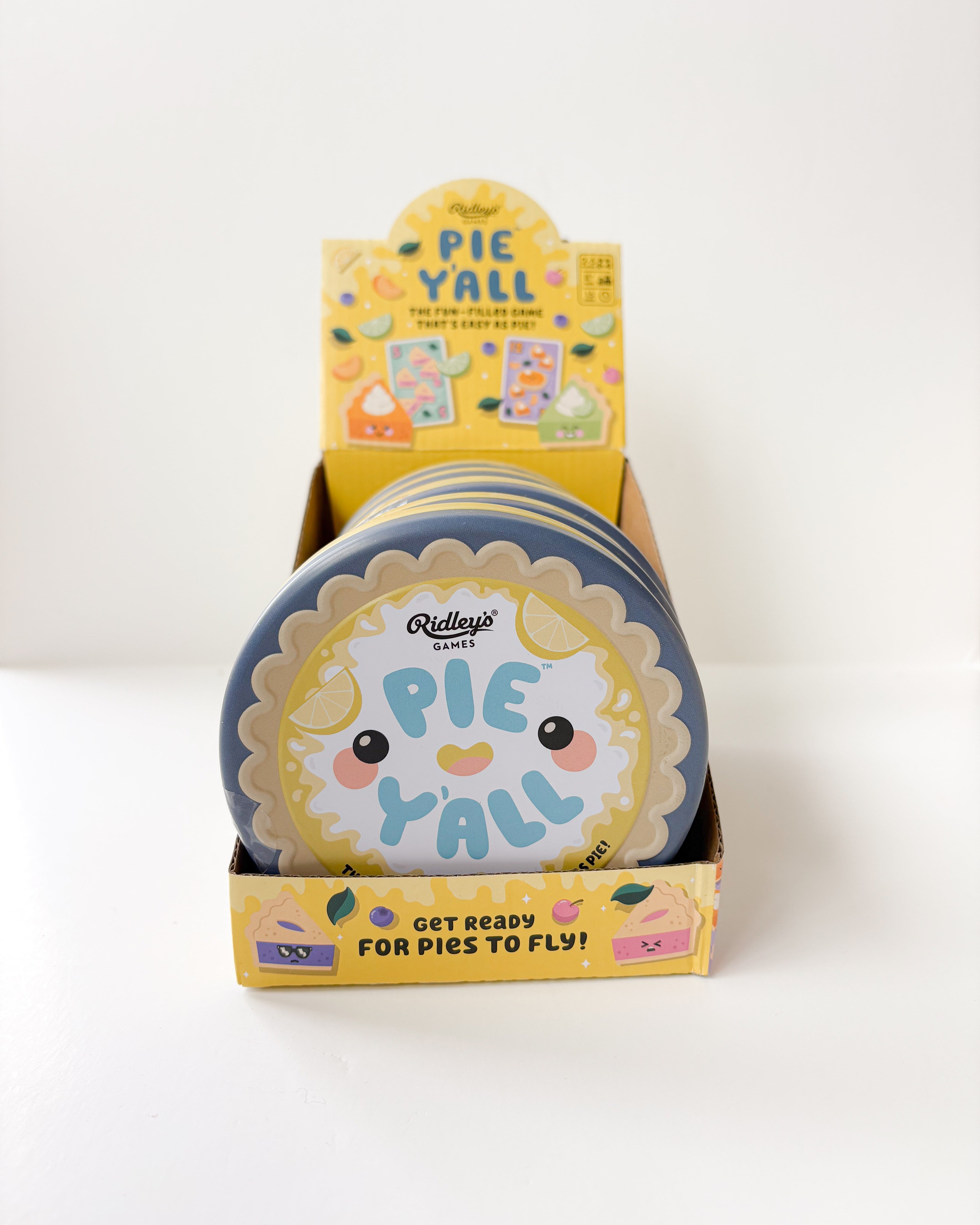 Try not to get pied in this game of Pie Y'all from Ridley's Games! In this fun-filled, family-friendly twist on the classic game of Sh*thead, don't be the one left with pie on your face! On your turn, try to play a card of equal or higher value if you can, and if not you need to pick up the entire discard pile. The object of the game is to not be the last person to be rid of all your cards, so you'll want to try to give away as much pie as possible! Be sure to keep a pie out for several upper crust cards like the Key Lime Pie-rate and the Lemon Buff Pastry! Perfect for pie enthusiasts, families, and groups of friends, it comes in a sweet pie illustrated tin and is suitable for ages 8+, 2-5 players, and has an average 15 minute gameplay.