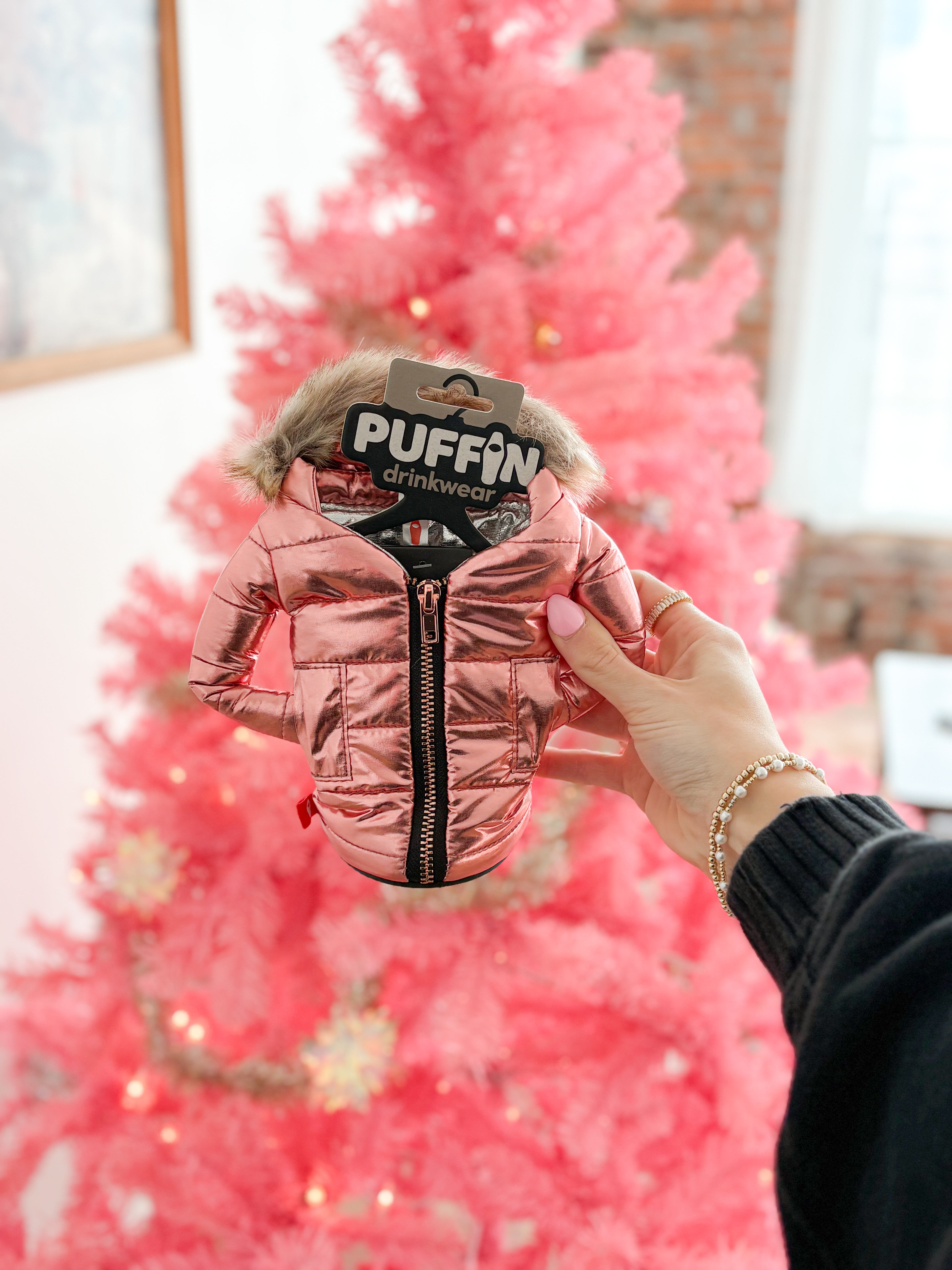 Add some flare to your winter drinkware wardrobe with a cozy Puffin Parka. The faux fur-lined hood brings a touch of glamour to a timeless classic! This diva will keep your drink cold and looking fabulous!! Fits both 12 oz and 16 oz tall cans well!