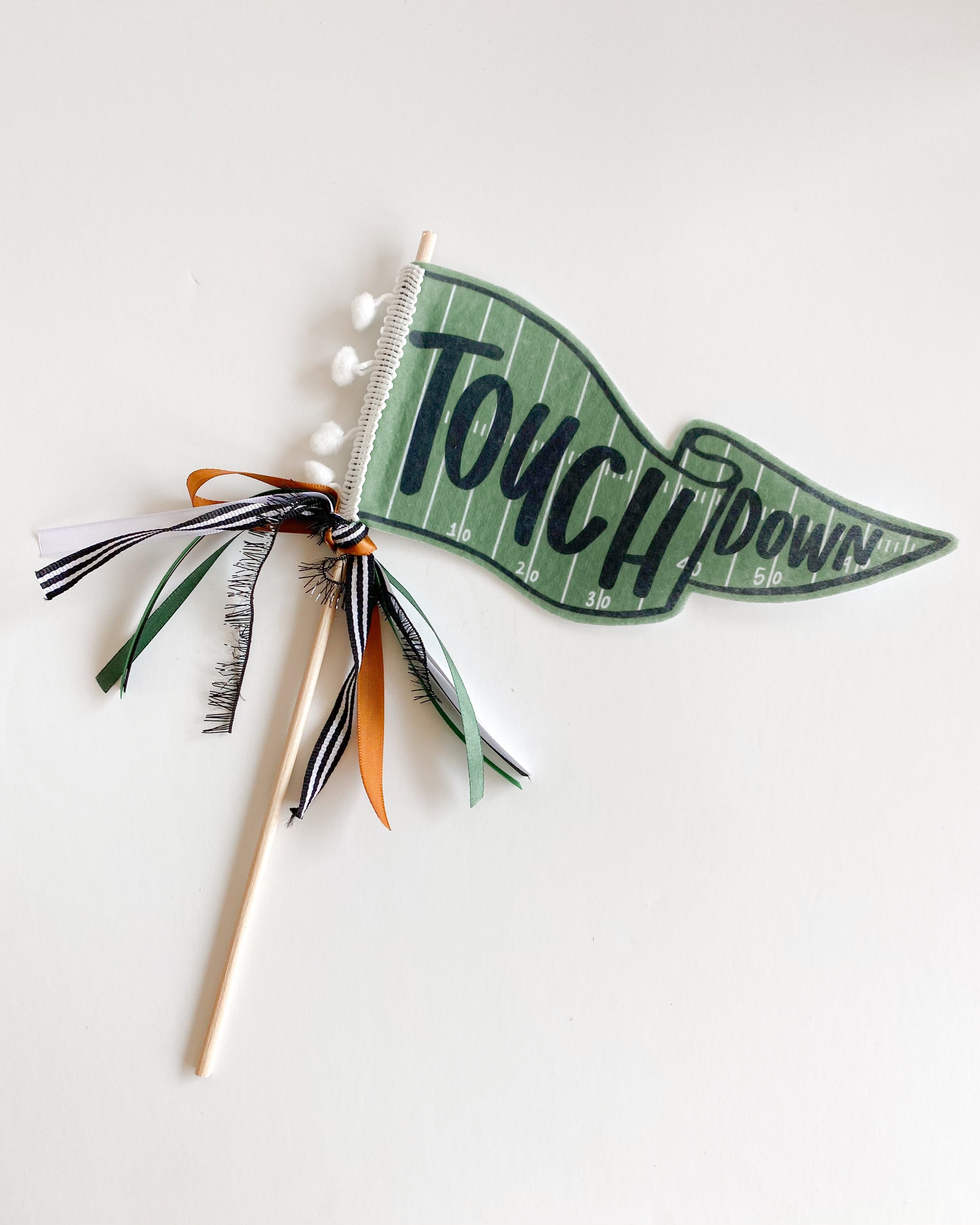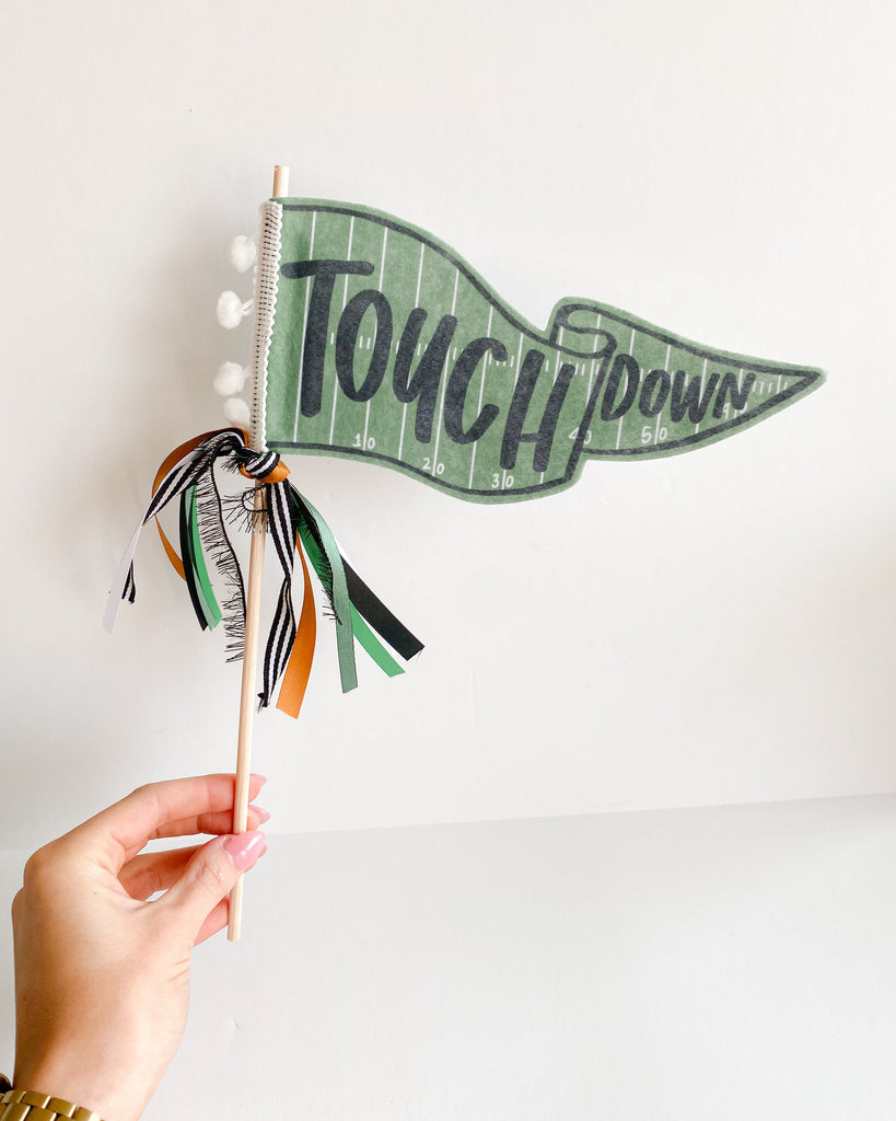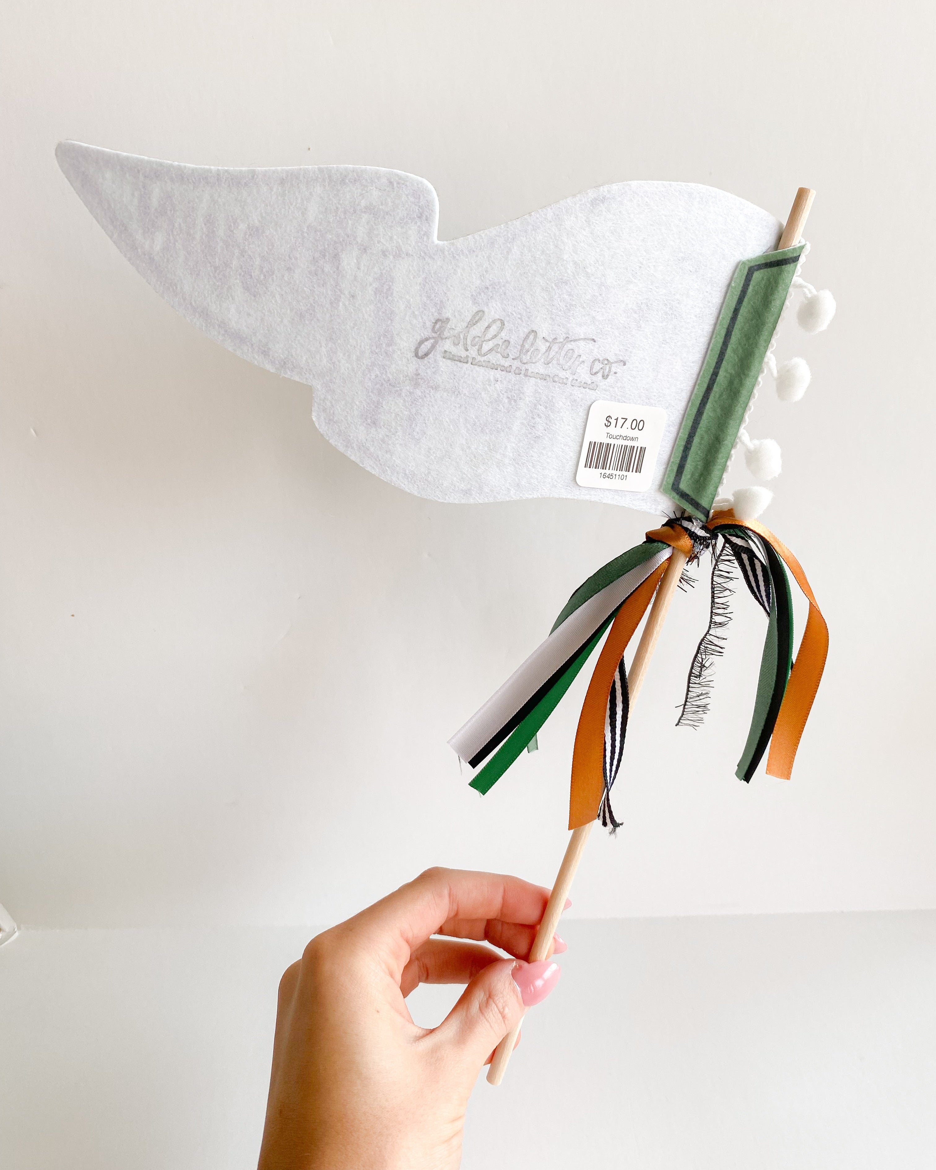 Felt pennant with attached wooden towel. Ribbons tied at end.