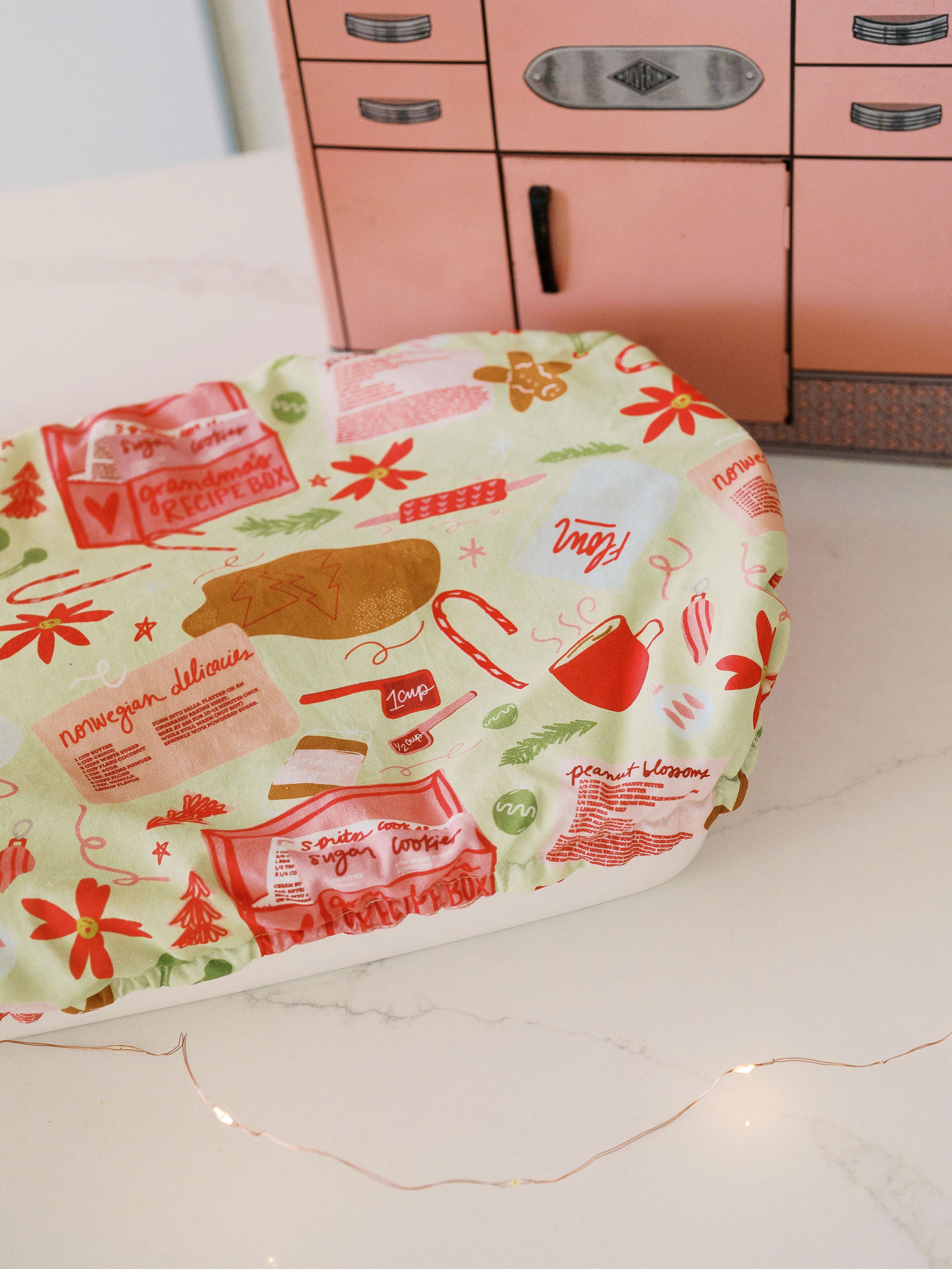 Whether you’re prepping Grandma’s sweet potato casserole or storing what’s left of that holiday dessert, this Baking Dish Cover brings the charm of Christmases past to your kitchen. Made to fit a standard 10x14 baking dish, it features our nostalgic recipe pattern on a green background—complete with candy canes, baking tools, and handwritten love.
