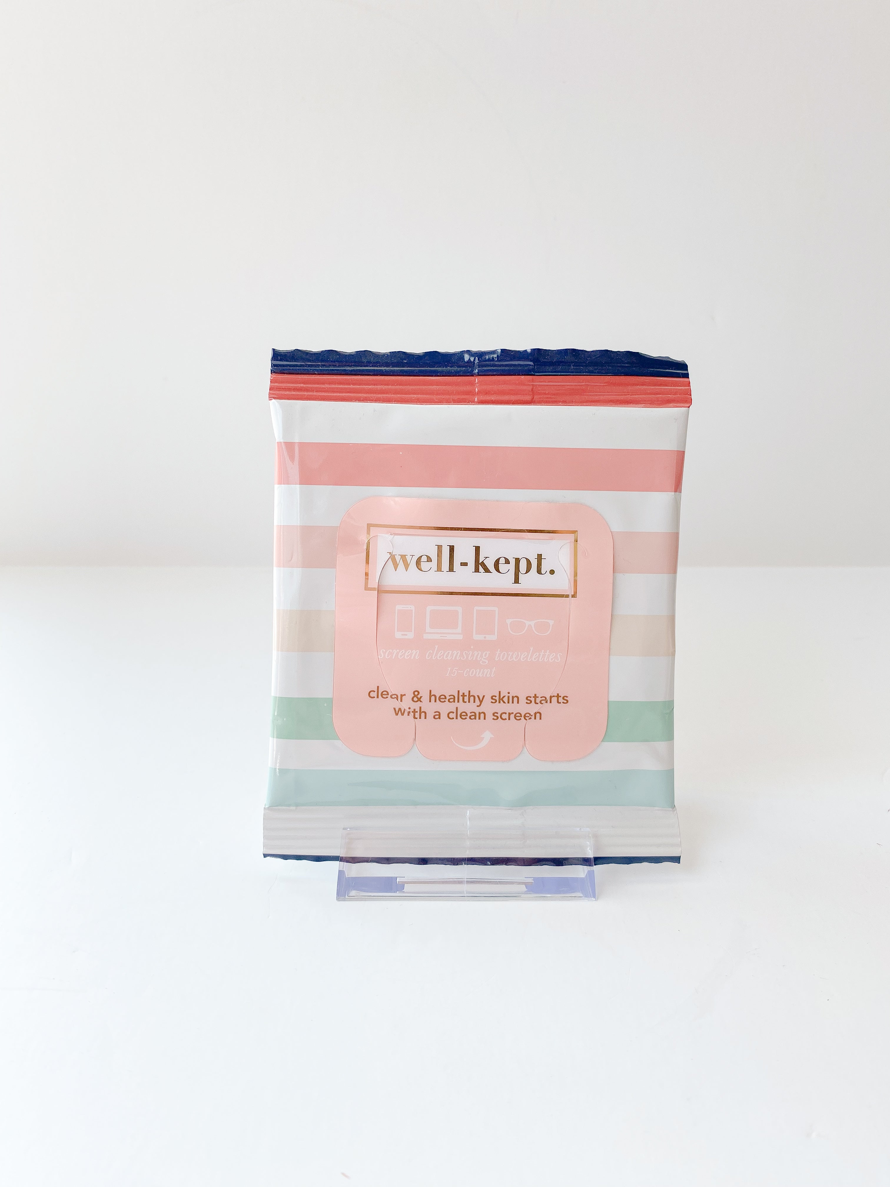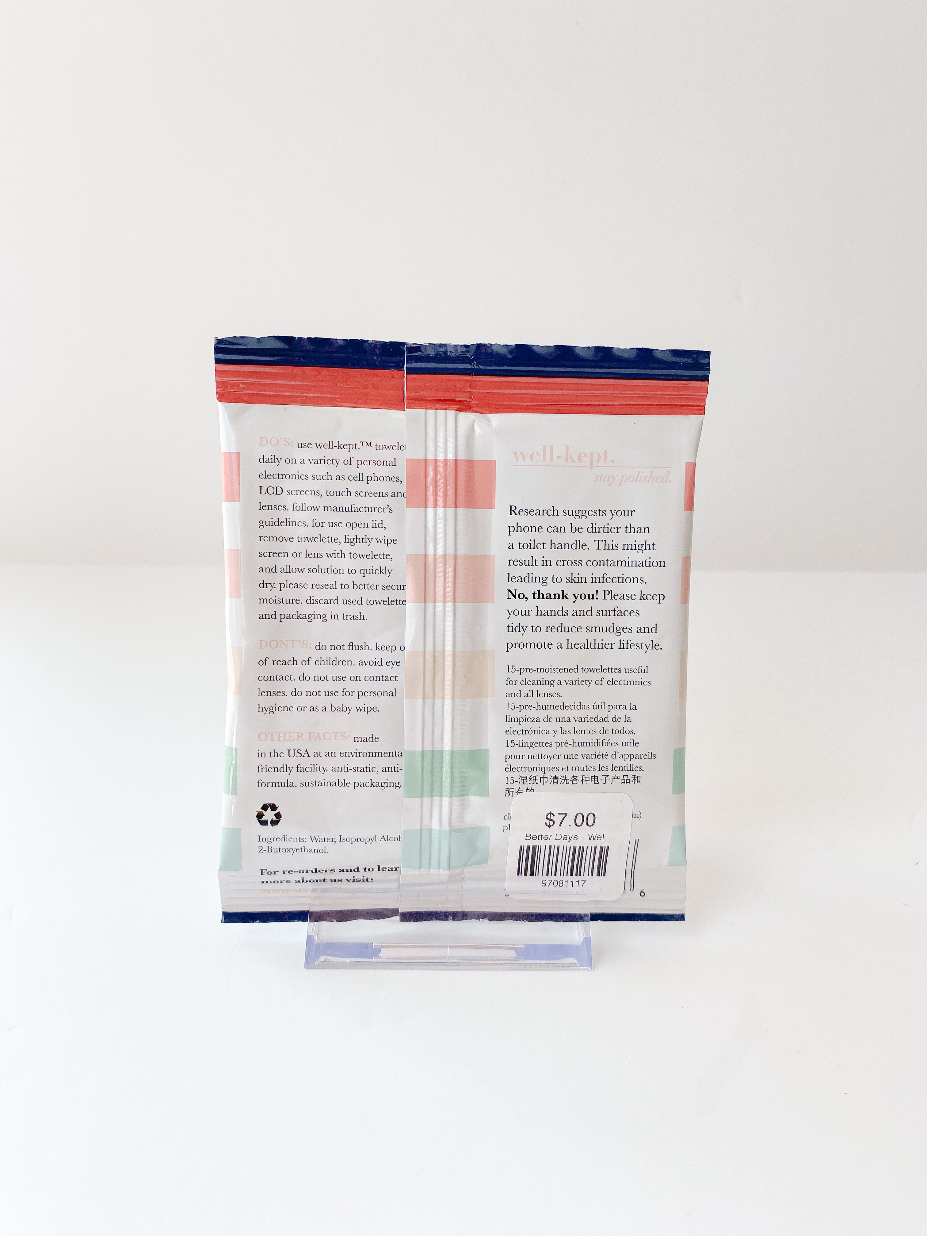 Resealable packs of pre-moistened towelettes designed to clean phones, glasses, tablets, earbuds, and other tech essentials. The quick dry, low lint cloths wipe away smudges and grime, leaving screens polished and clear. This cheerful rainbow striped design with a blush tab adds color and joy to any display.