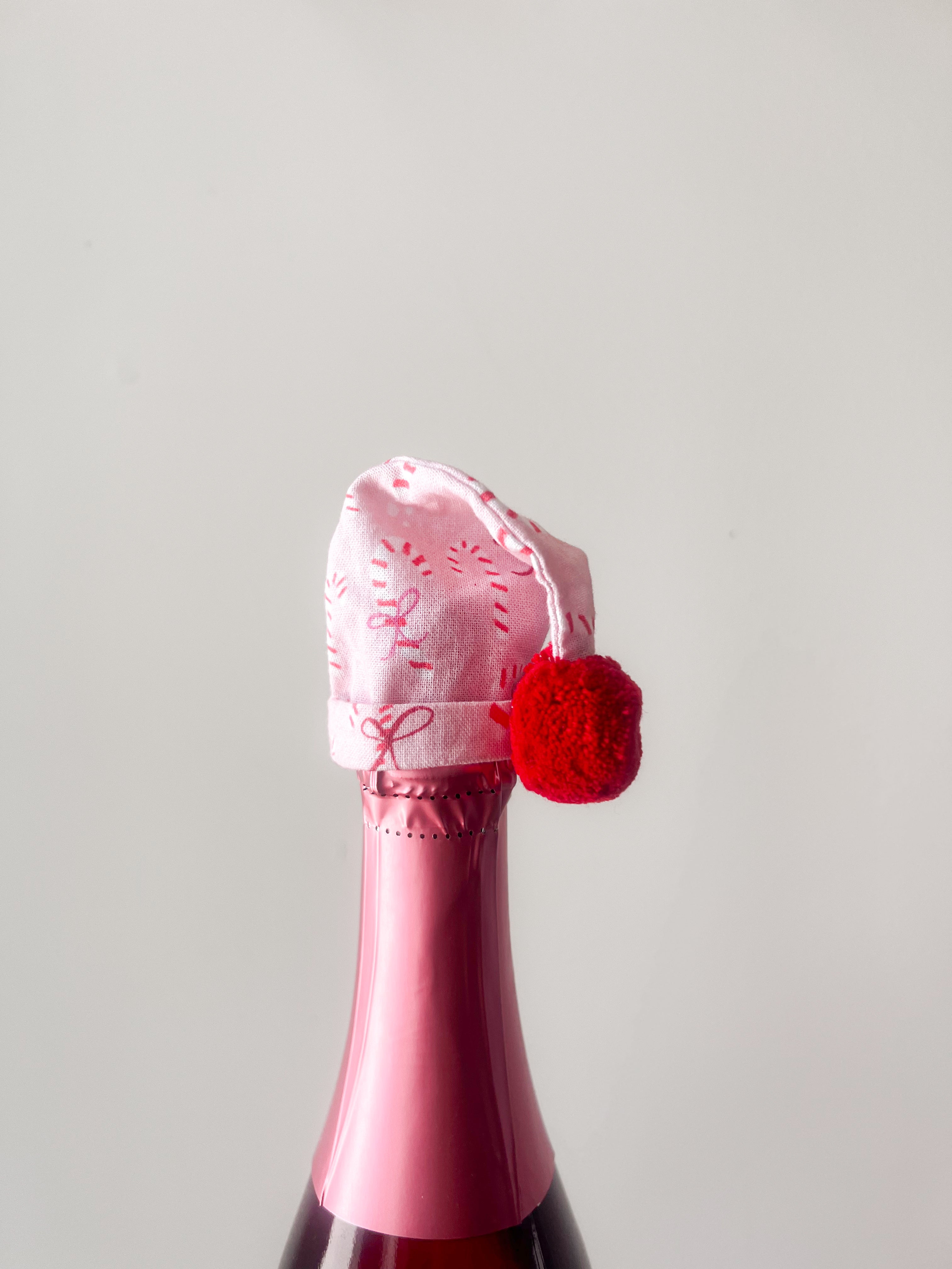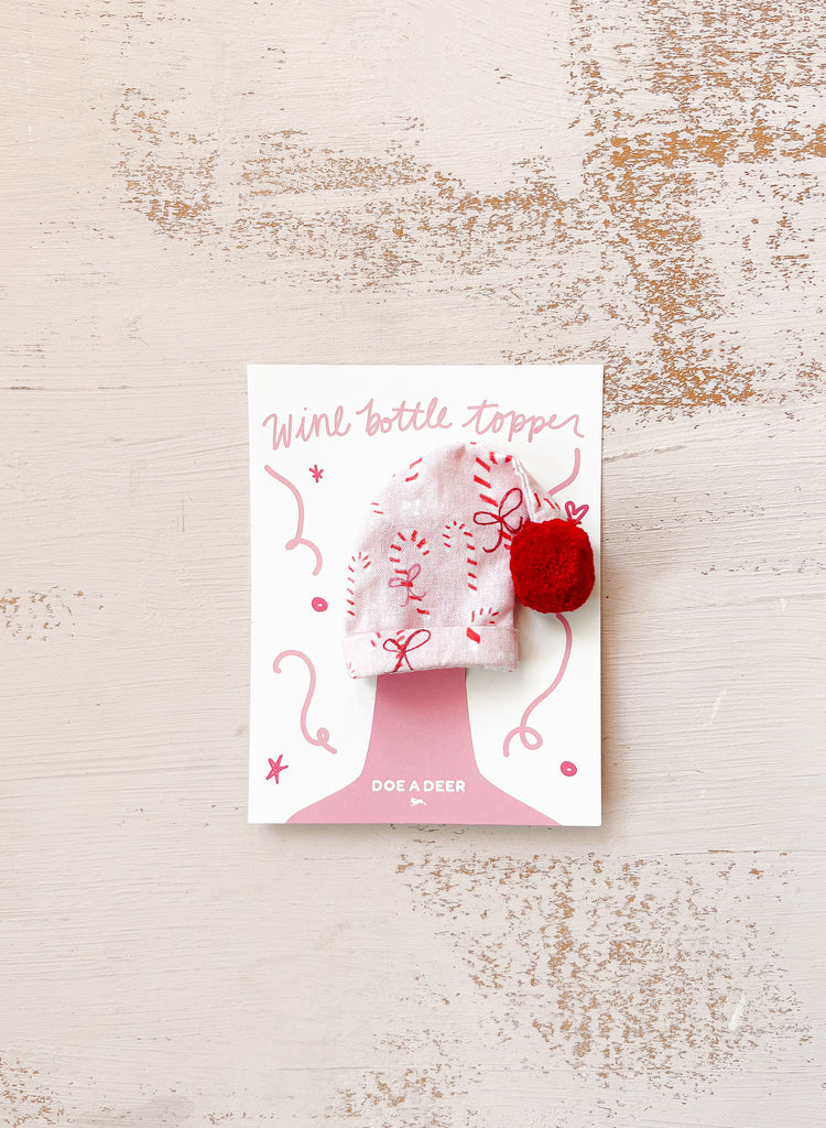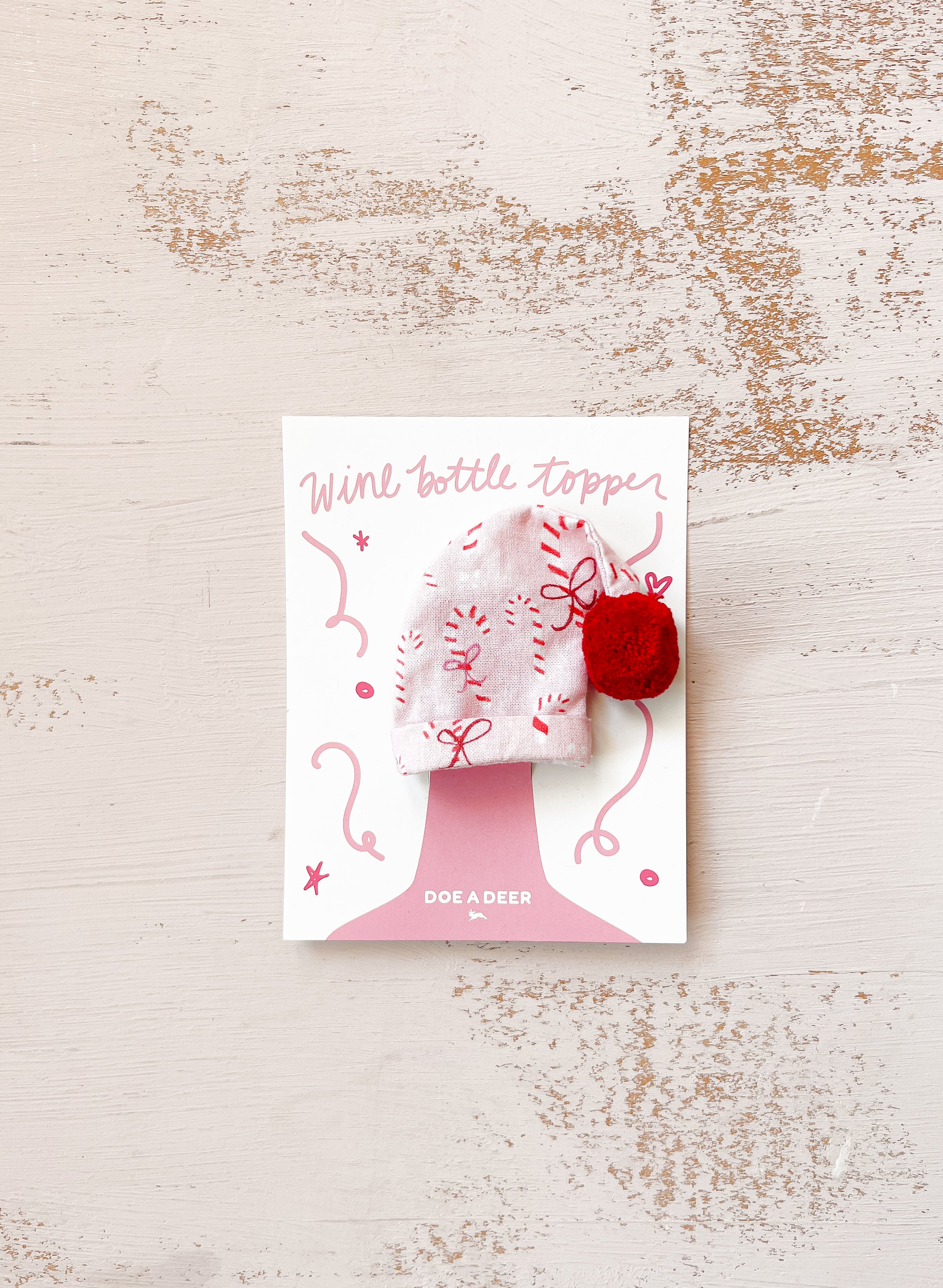 Top off your favorite bottle with a twist of holiday cheer! This Candy Cane wine topper features a playful pink pattern with classic candy canes and festive bows—perfect for dressing up wine gifts, holiday tables, or cozy night-ins. A merry little touch for your favorite merlot!