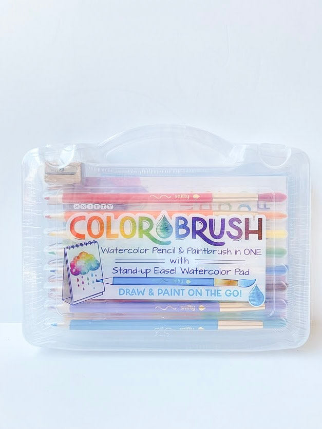 Take your studio with you with our on-the-go kit! Snifty Colorbrush is the amazing double ended watercolor pencil & paintbrush in one! Draw, sketch & color. Flip to dip paintbrush in water and transform drawings into watercolor paintings. Just add water and imagination! Kit includes set of 8 colorbrush, wooden sharpener and 4" x 6" artist easel pad!