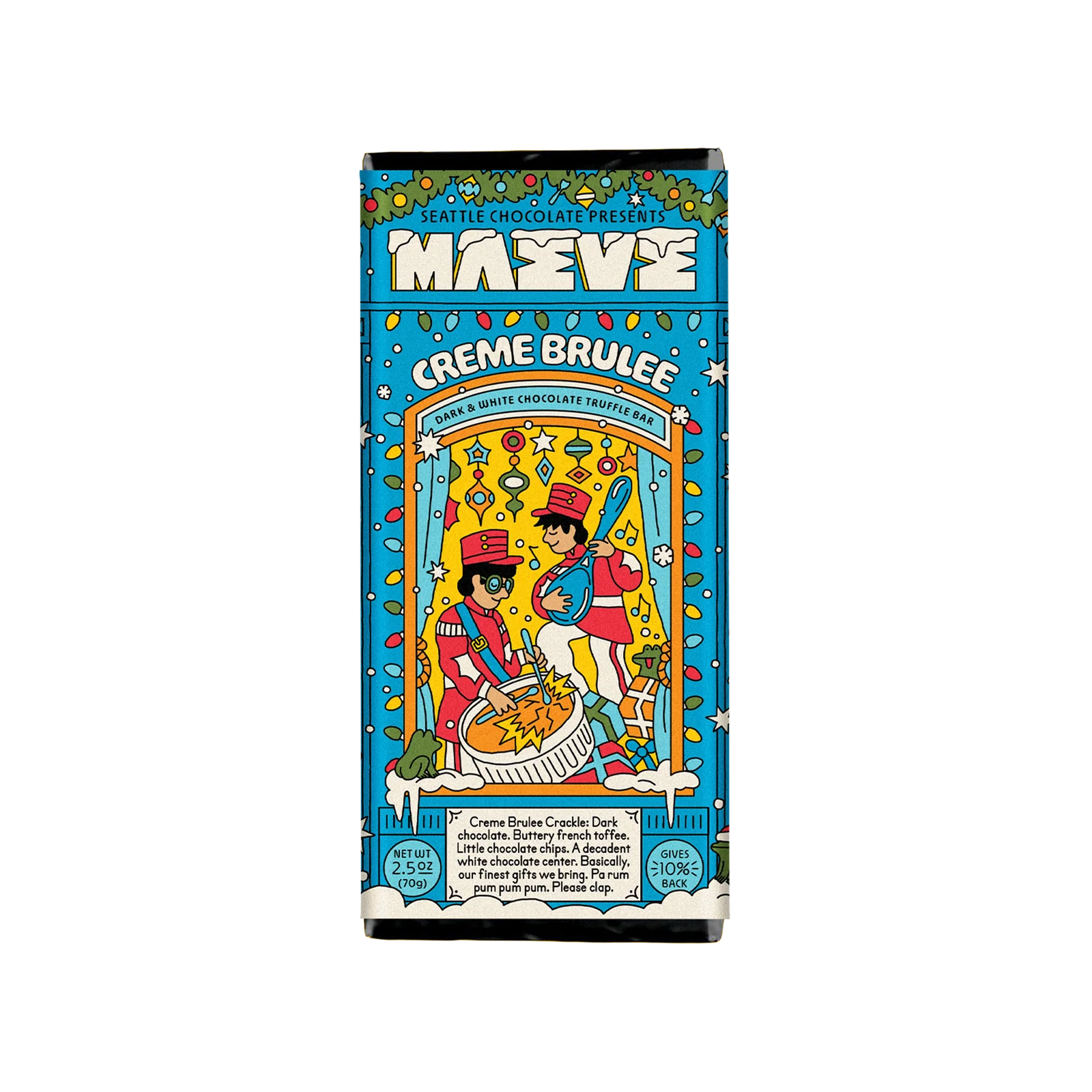 Dark chocolate with buttery French toffee bits, tiny chocolate chips, and a creamy white chocolate center inspired by classic crème brûlée. Crackly, creamy, and as satisfying as breaking through that caramelized sugar top, this chocolate bar is proof that holiday magic is real and absolutely edible.