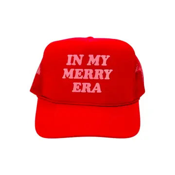 IN MY MERRY ERA in light pink velvet stripflock on red rucker hat! This hat is a unisex fit.