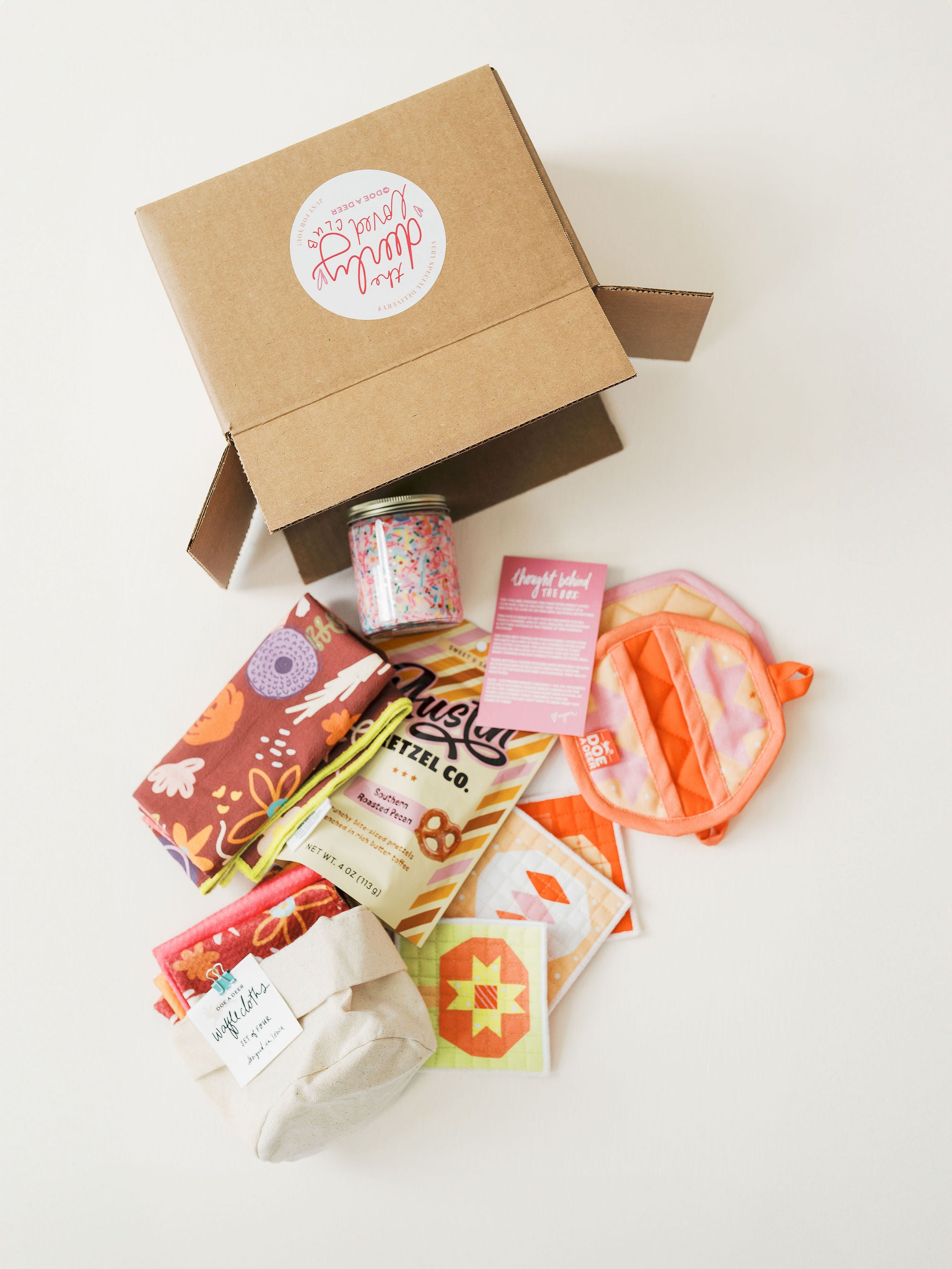 Every other month, you’ll receive a beautifully curated box filled with 3-4 brand-new Doe A Deer products before anyone else gets their hands on them! But that’s not all—each box also includes: