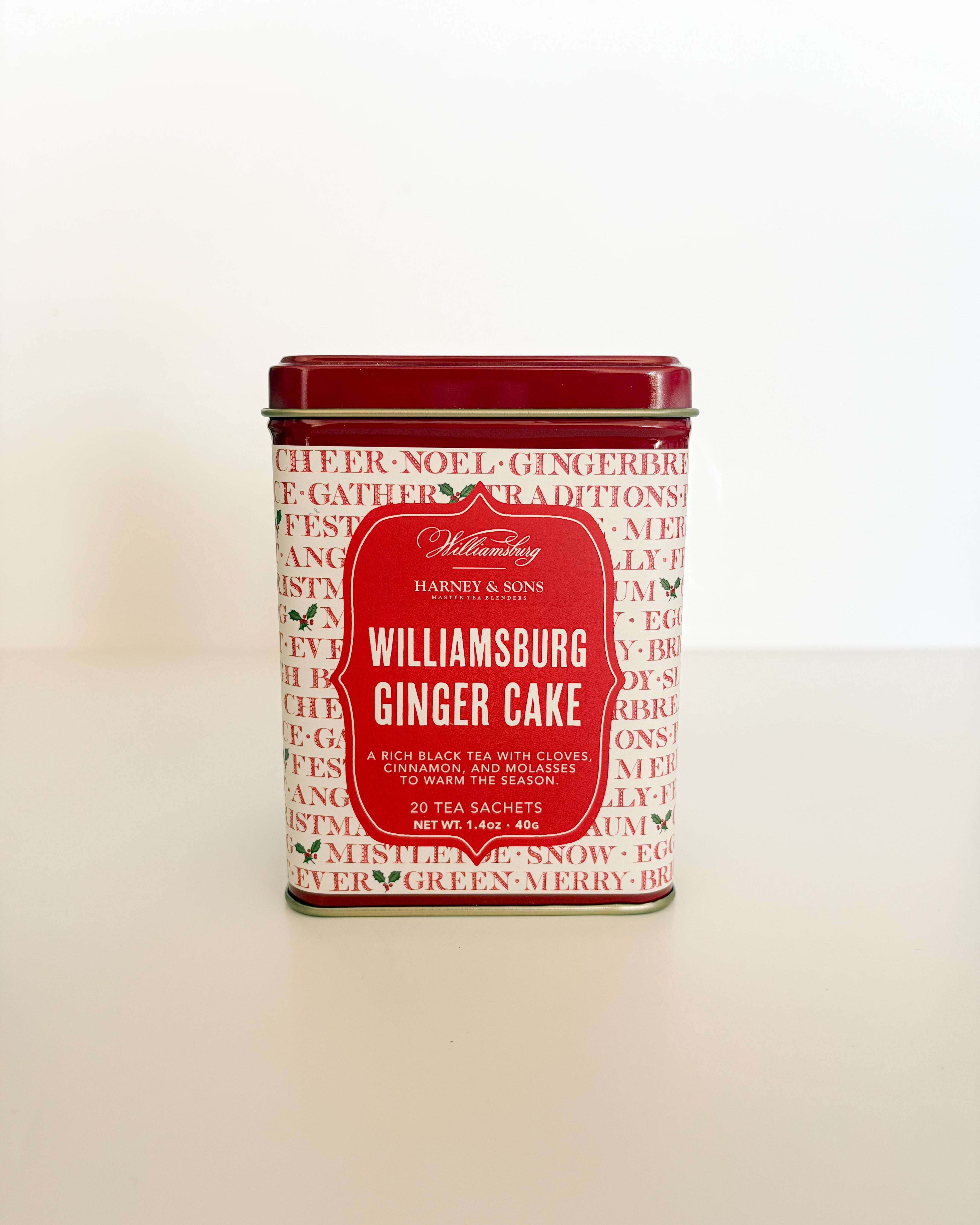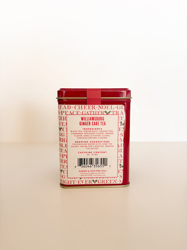 Let the festive aroma of WILLIAMSBURG Ginger Cakes Tea by Harney & Sons warm your home and spirit this holiday season. This flavorful tea blend comprises black tea, orange peel, cinnamon, ginger root, cloves, and flavors of molasses and vanilla. Packaged in a beautiful limited-edition tin for gifting.